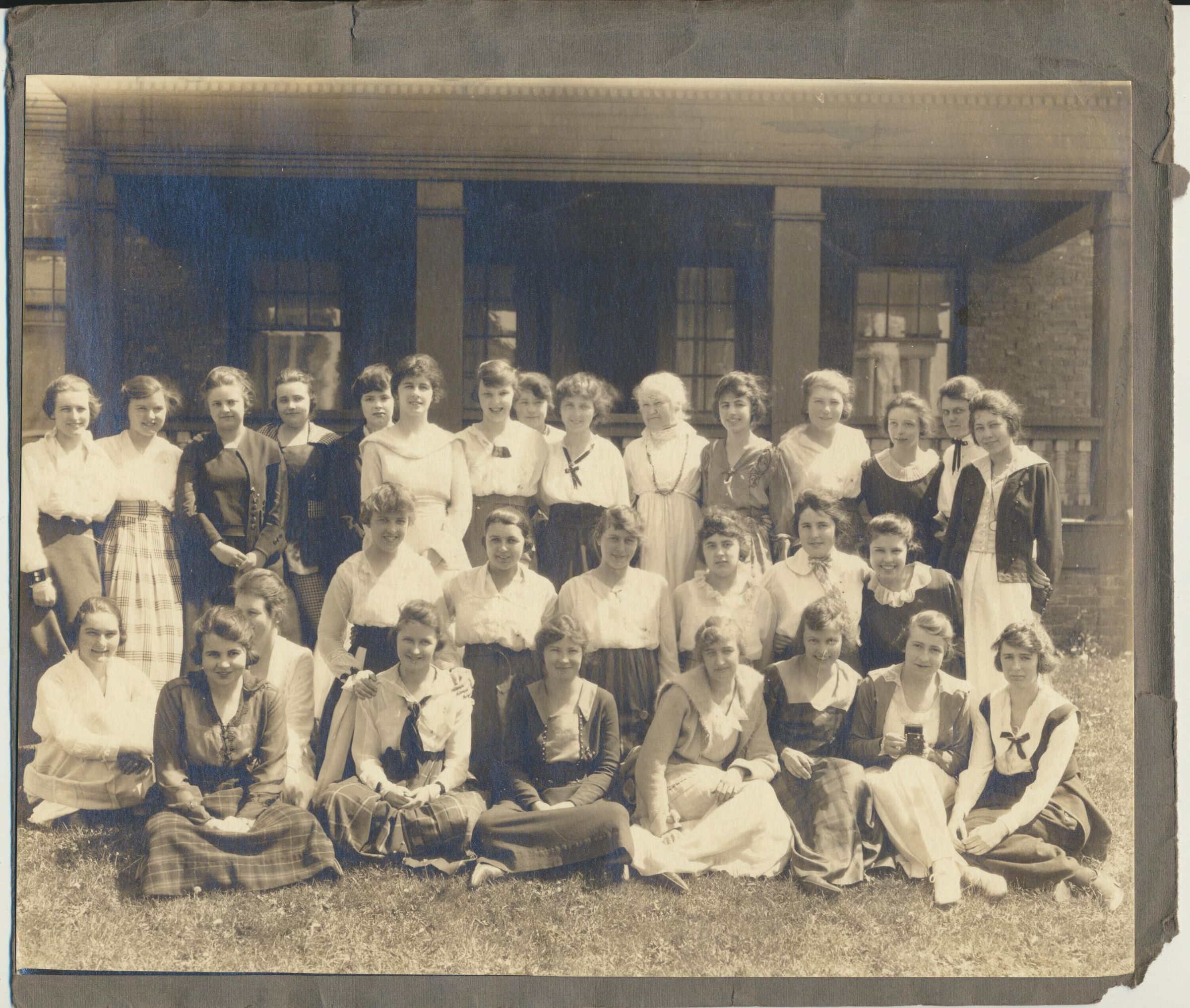 Print, photographic. 9 1/2 x 7 1/2 sepia. Class of girls posed for class photo from unidentified school, but is probably the Sigma Kappa sorority group at University of Washington. Helen Shank is third from left in back row.