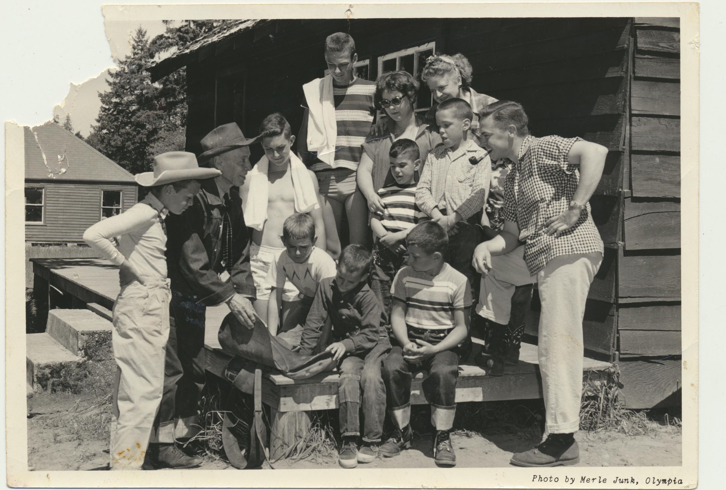 Print, photographic. 7 x 4 1/2 b&w . Image of 3 adults and several children gathered in front of a cabin. Helen Shank is at upper right. No ID on others. This was at the original Trail's End camp on Hood Canal.