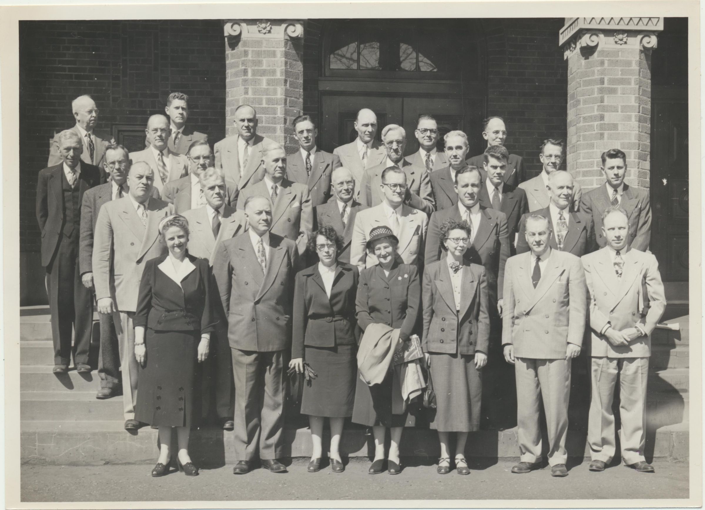 Print, photographic. 6 1/2 x 5 b&w . Image of group of men and women in front of an unidentified building. Helen Shank is at far left of front row. No ID on others, or on occasion.