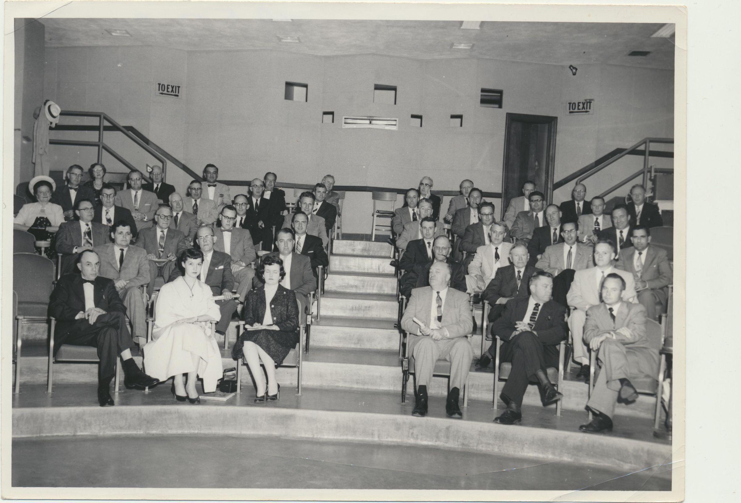 Print, photographic. 6 1/2 x 5 b&w . Image of group of men and women in auditorium. Helen Shank is at far left in 4th row from bottom. Written on back is "Maple Lane staff meeting Western State Hospital, 1952?"