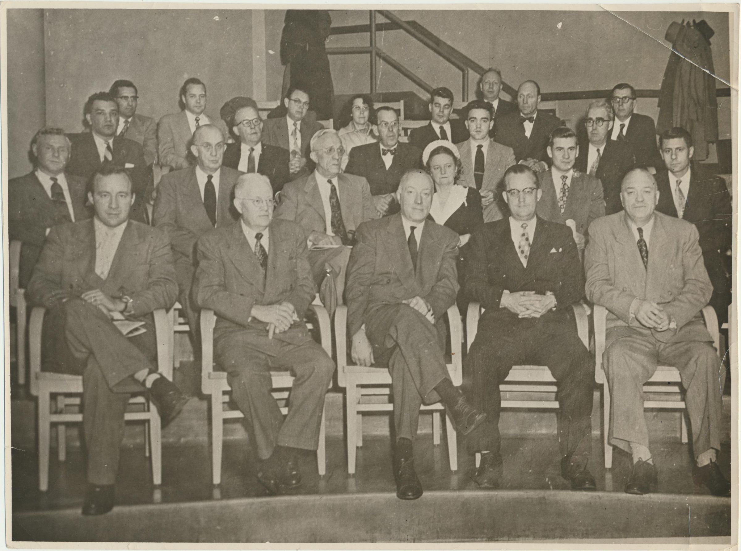 Print, photographic. 9 x 7 b&w . Image of group of men and women seated in an auditorium at Western State Hospital. Helen Shank is 3rd from right in 2nd row up. No ID on other people, or on occasion.