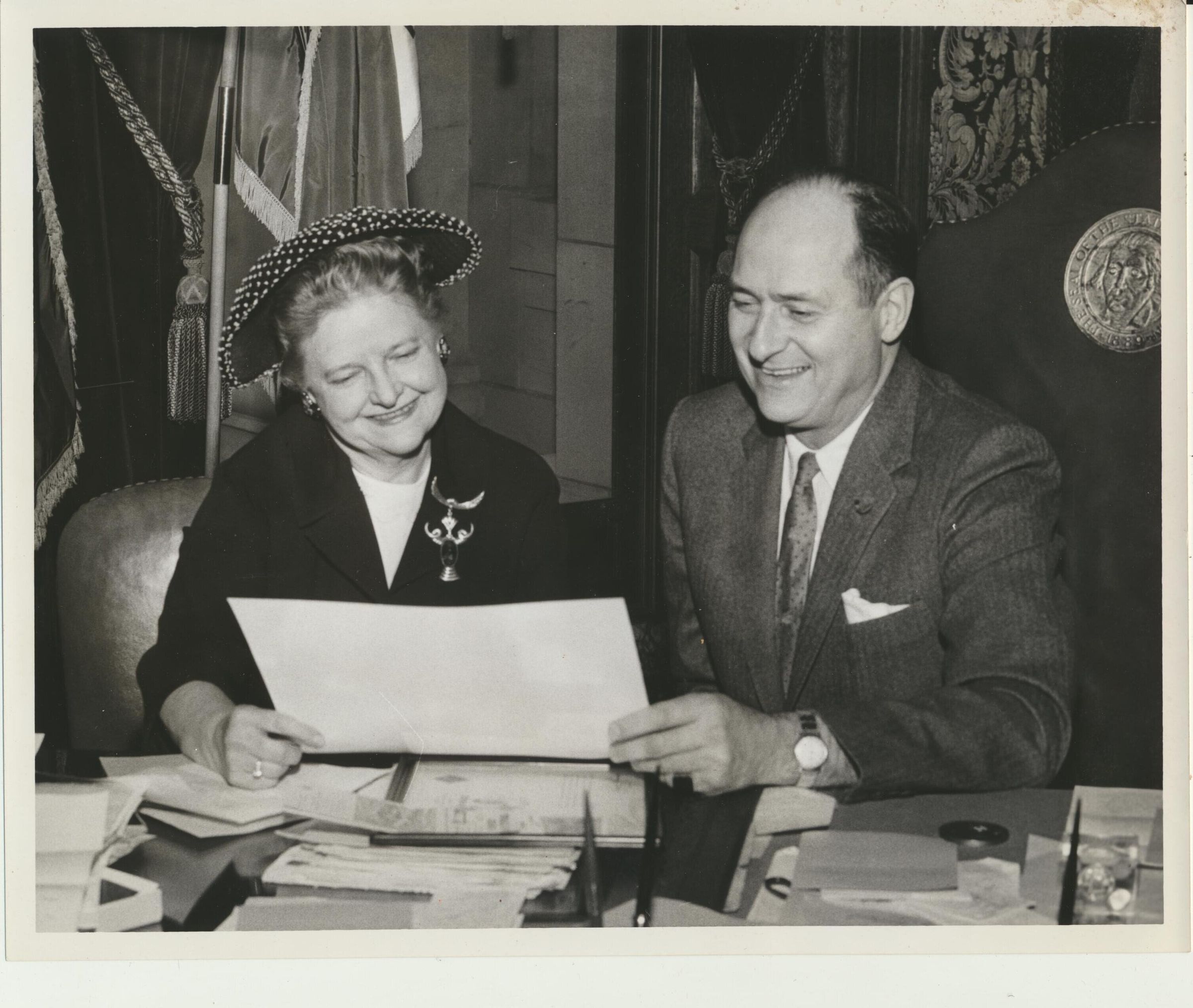 Print, photographic. 7 x 9 b&w . Image of Helen Shank and Washington Governor Albert Rosellini looking at documents, March 10, 1960. Occasion was appointment of Helen to State Board of Prison Terms and Parole.