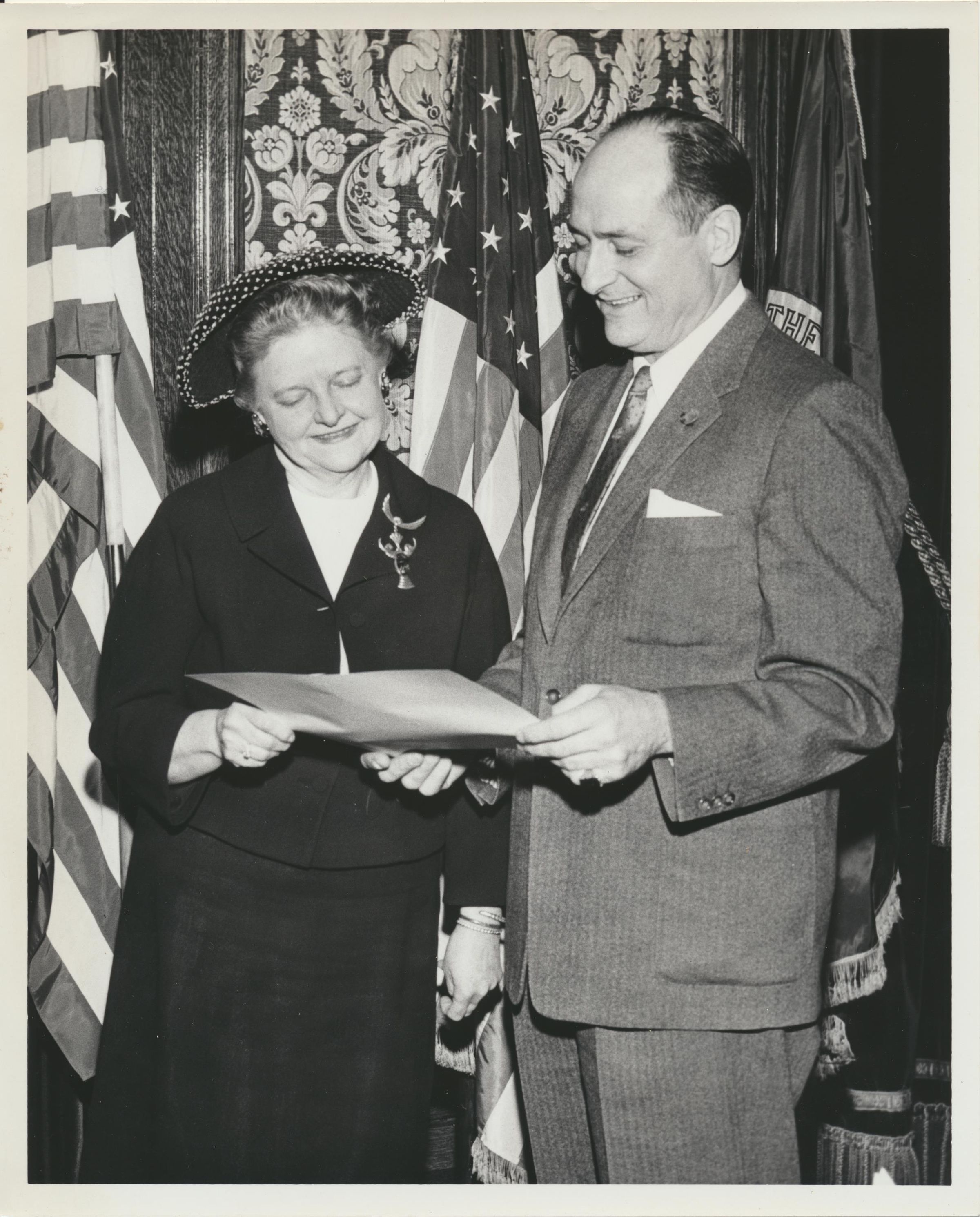 Print, photographic. 7 x 9 b&w . Image of Helen Shank and Washington Governor Albert Rosellini, March 10, 1960. Occasion was appointment of Helen to State Board of Prison Terms and Parole.