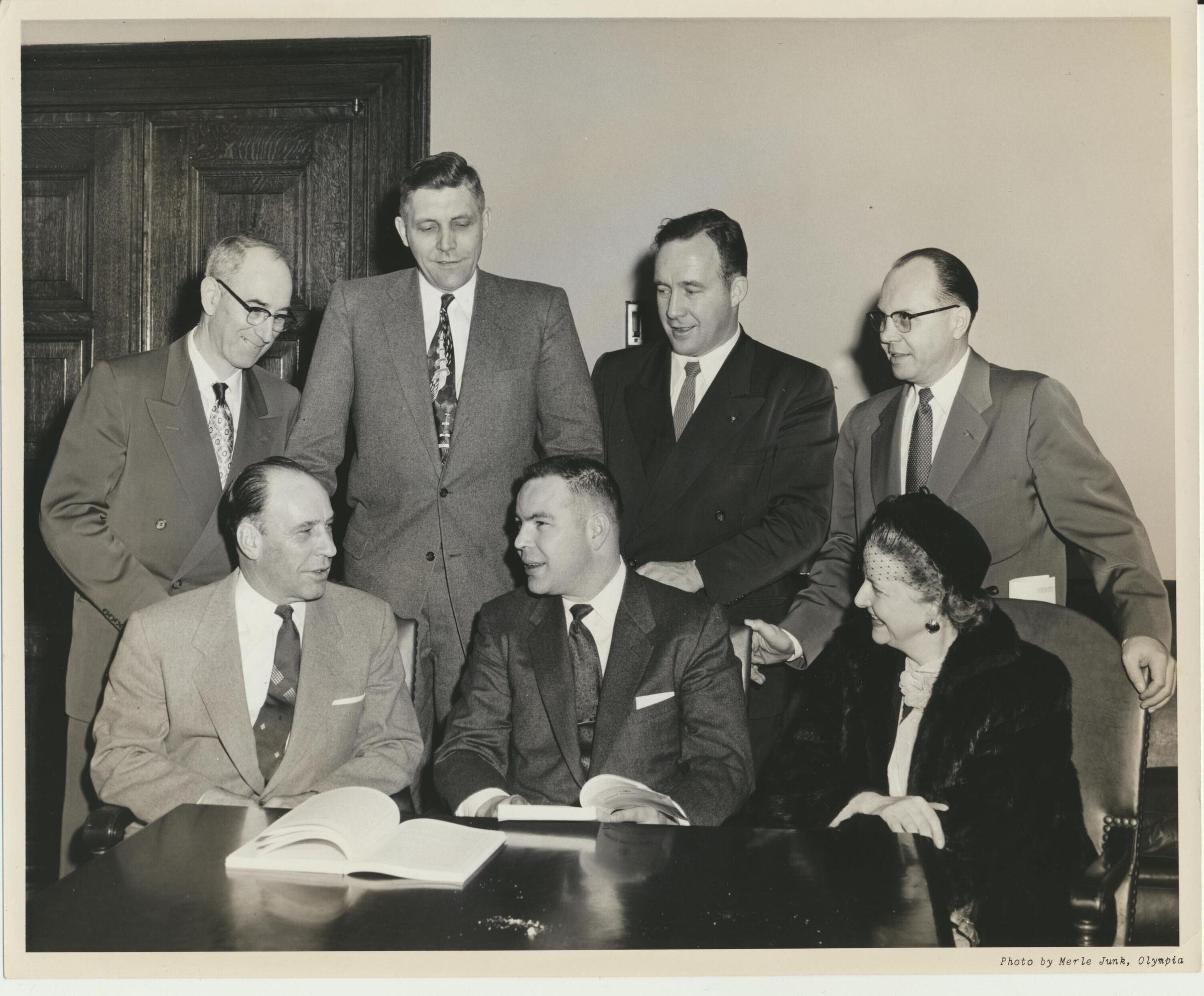 Print, photographic. 7 x 9 b&w . Image of group of adults. Helen Shank is seated at right. No ID on others, location or occasion.