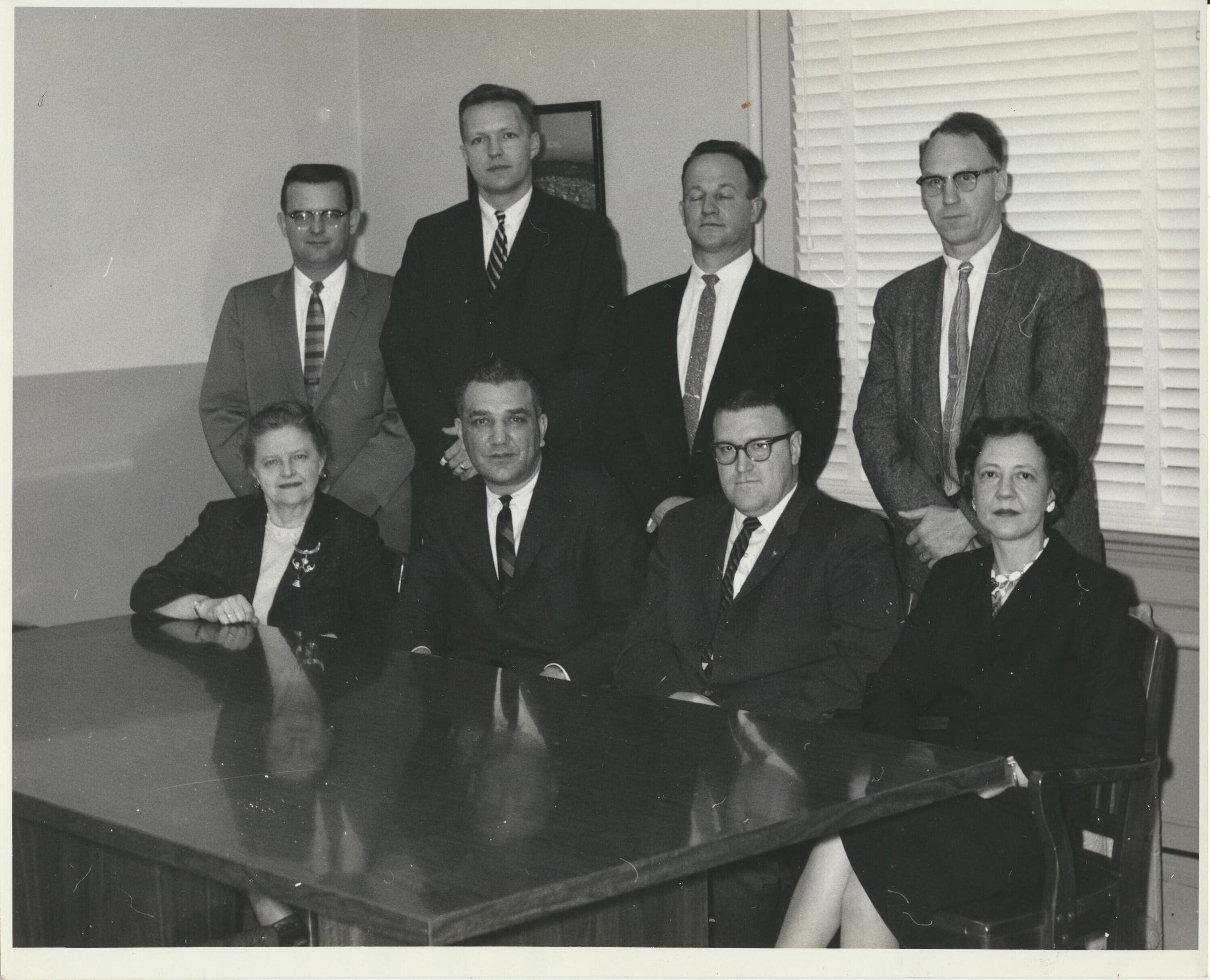Print, photographic. 7 x 9 b&w . Image of group of adults. Helen Shank is seated at left. No ID on others, location or occasion. All identified on back of photo. All seem to be associated with schools for troubled youths.