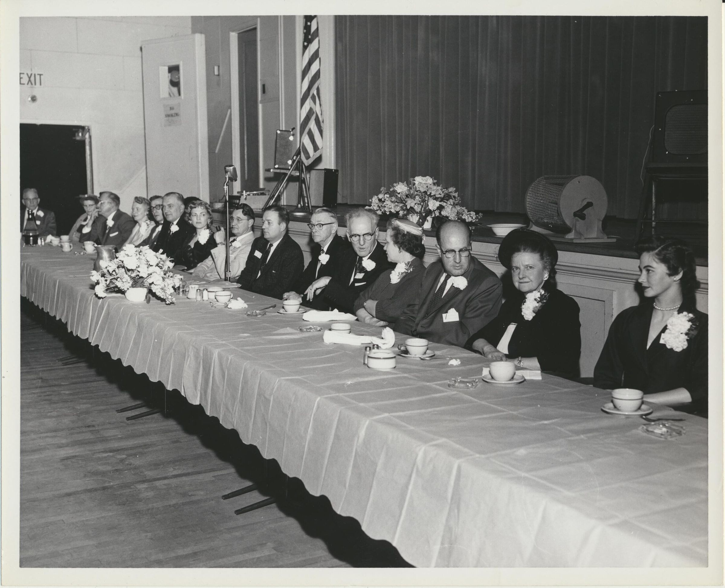 Print, photographic. 7 x 9 b&w . Image of group of adults seated at unidentified event. Helen Shank is seated 2nd from right. No ID on others, location or occasion.