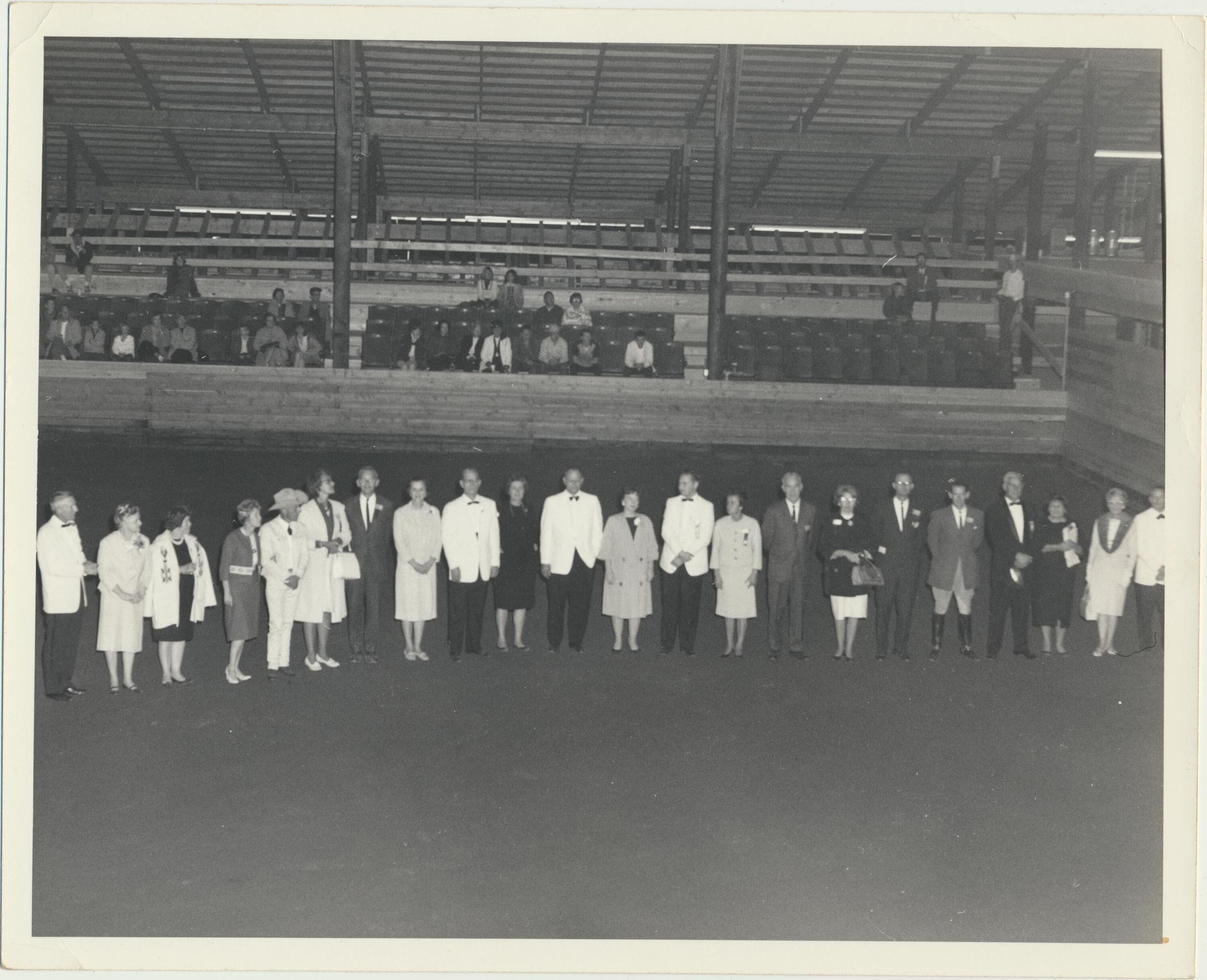 Print, photographic. 7 x 9 b&w . Image of group of adults standing in equestrian center, probably Trails End Stables in Tumwater. Group of people in grandstand seats. Helen Shank may be standing 2nd from left. No ID on others, or occasion.