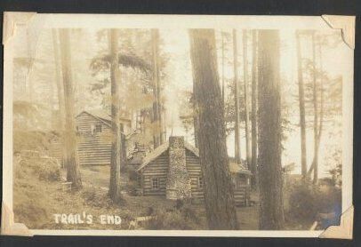 Print, photographic. 5 1/2 x 3 1/2 sepia. Image of 2 log cabins in woods with water in background. Photo marked "Trail's End."