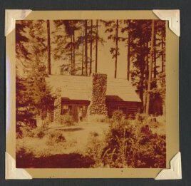 Print, photographic. 3 x 3 b&w . Image of log cabin in woods.