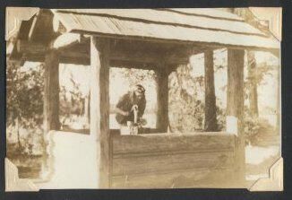 Print, photographic. 4 1/2 x 2 3/4 sepia . Image of woman pumping water at wellhouse. No ID on woman.