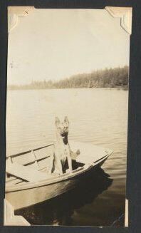 Print, photographic. 2 1/4 x 4 sepia. Image of large dog in boat.