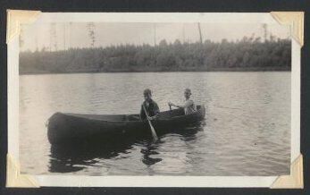 Print, photographic. 4 1/2 x 2 1/2 b&w. Image of 2 boys in canoe on water.