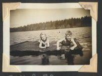 Print, photographic. 2 1/4 x 1 1/2 b&w. Image of boy and girl on wooden float in water.