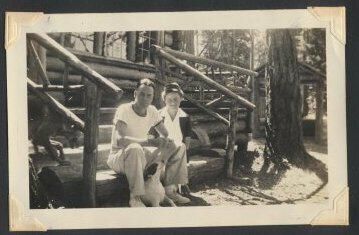 Print, photographic. 4 x 2 1/2 b&w. Image of Jack and Helen Shank seated on wooden stairs, with dog.