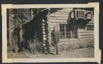Print, photographic. 4 x 2 1/2 b&w. Image of Jack Shank in military uniform, standing in front of log cabin.