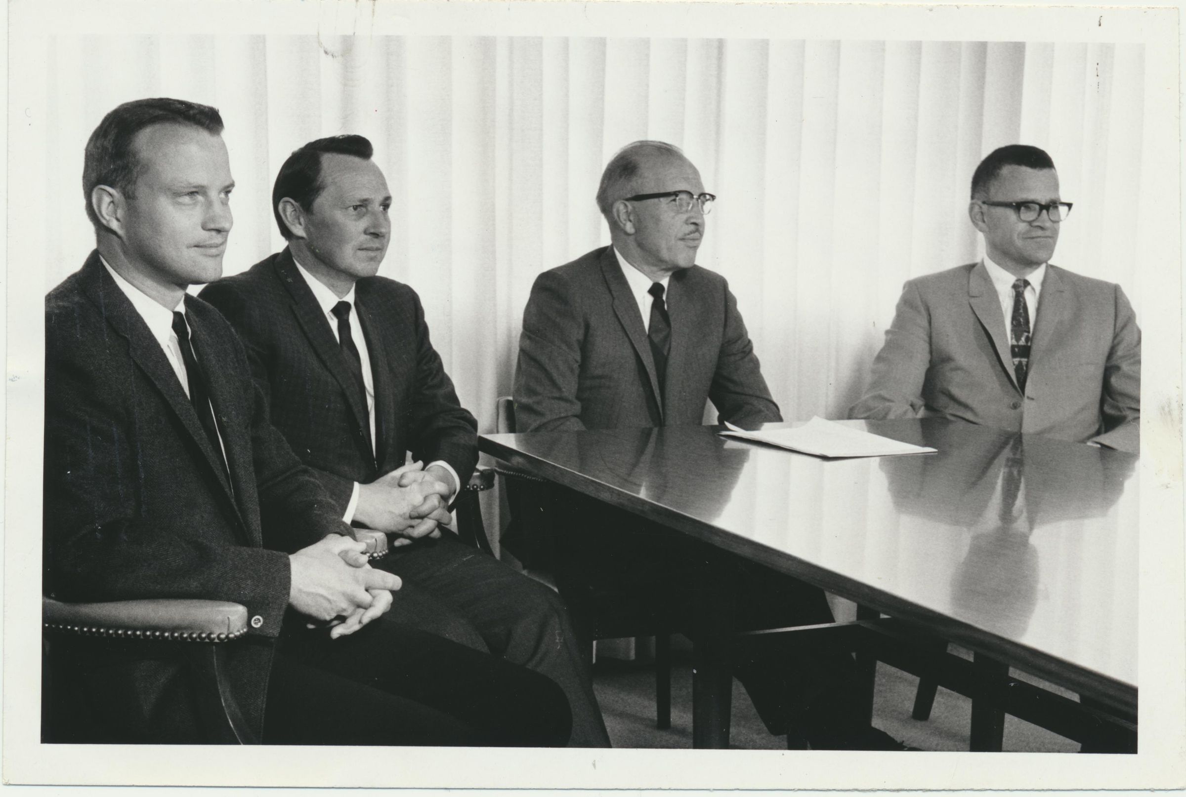 Photograph. B&W. Size 4 x 6. Photograph of four officers of the Tumwater Valley Development Company: James Senna, Philip "Skip" Schmidt, Thomas Morgan, and James Haight. On back newsprint is pasted with names of the men, and June 16, 1968 written.Name/Title