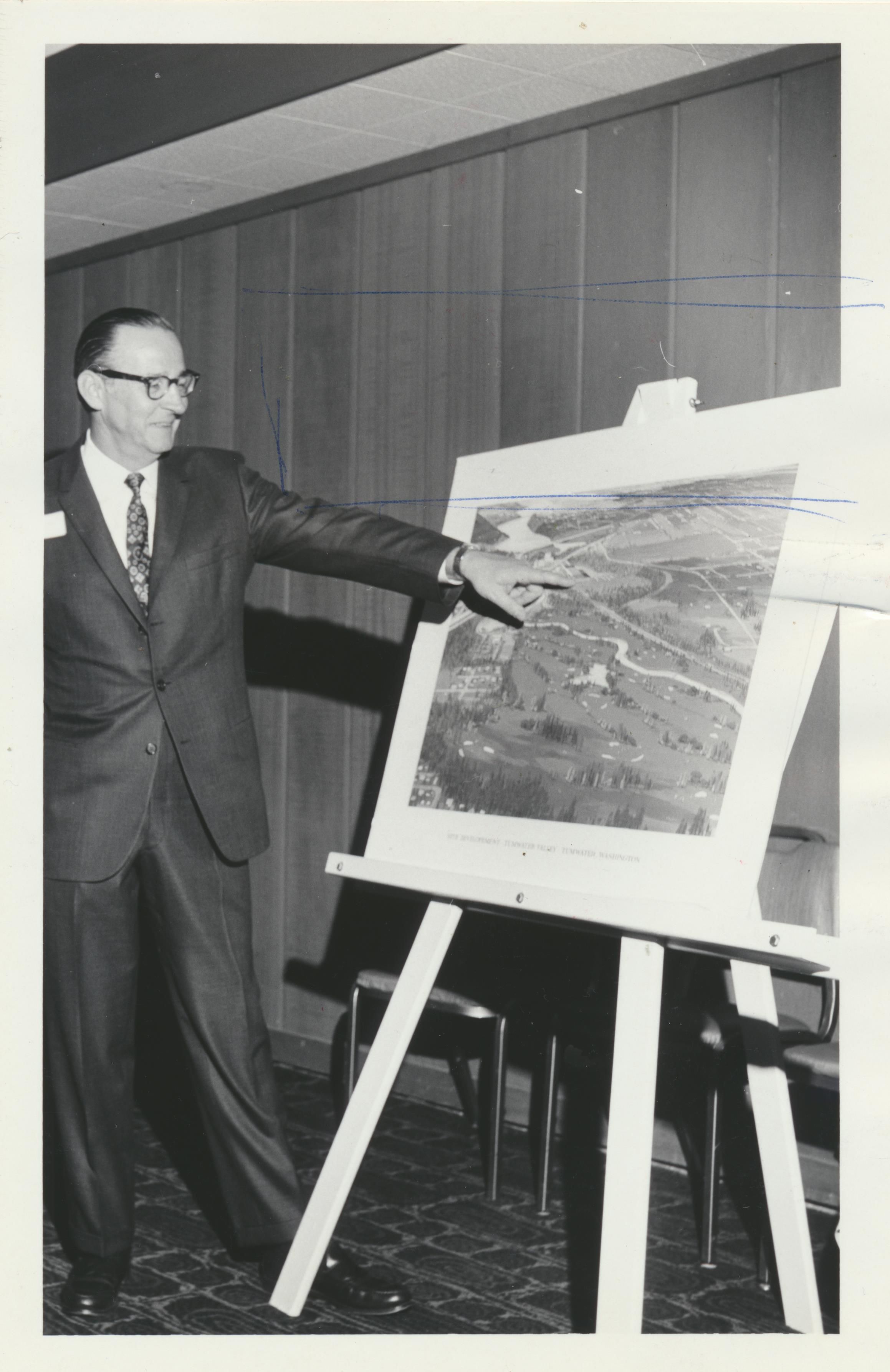 Photograph. B&W. Size 4 x 6. 1968 Photograph of Bobby Schmidt next to an easel of the proposed Tumwater Valley golf course.