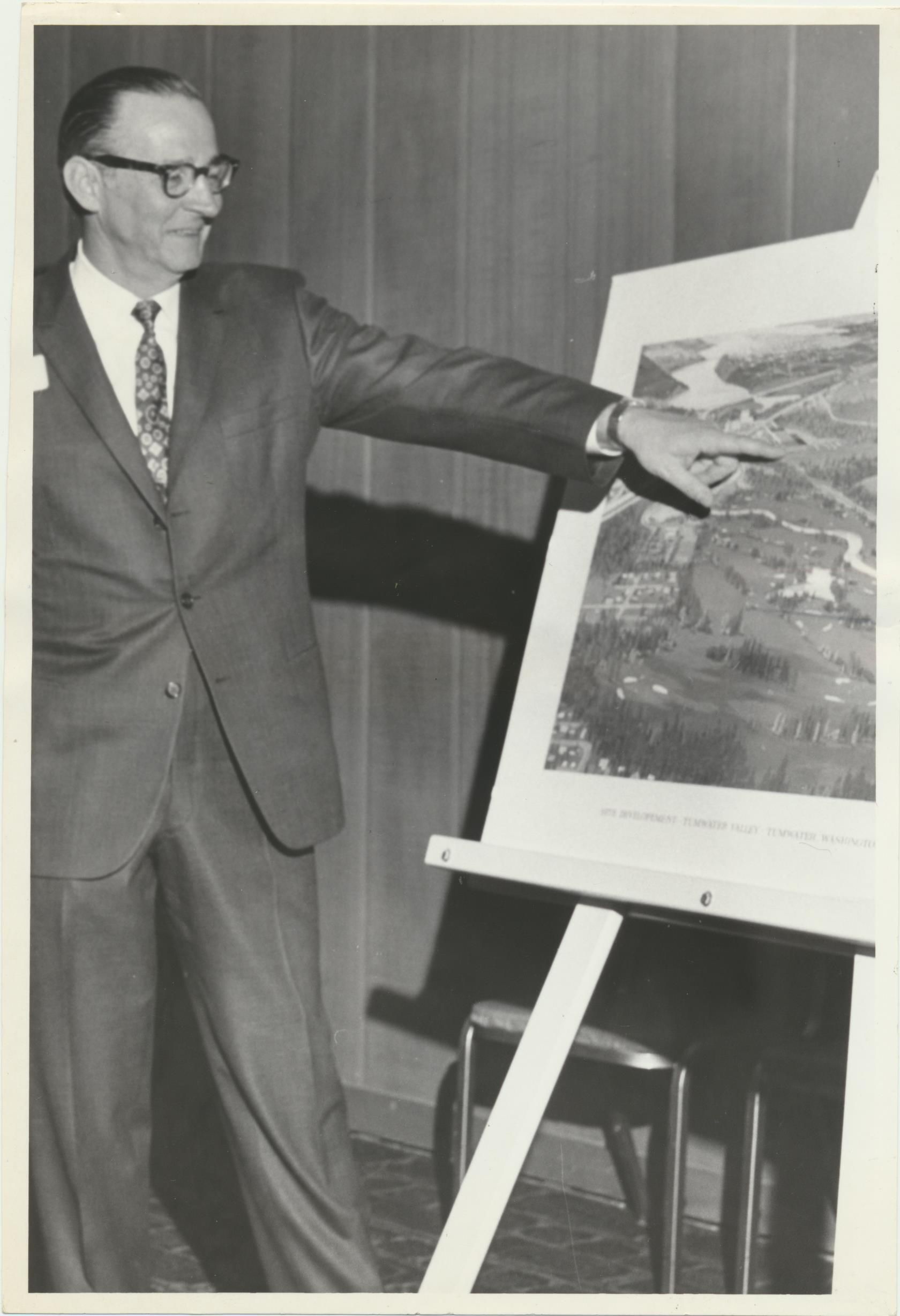 Photograph. B&W. Size 5.5 x 8.25. 1968 Photograph of Bobby Schmidt next to an easel of the proposed Tumwater Valley golf course. Same as photo 2017.13.023. Pasted on the back is news item: "Brewery President Robert A. (Bobby) Schmidt from Out Of The Swamp, a 12-Year Triumph." Date stamped May 16, 1968.Name/Title