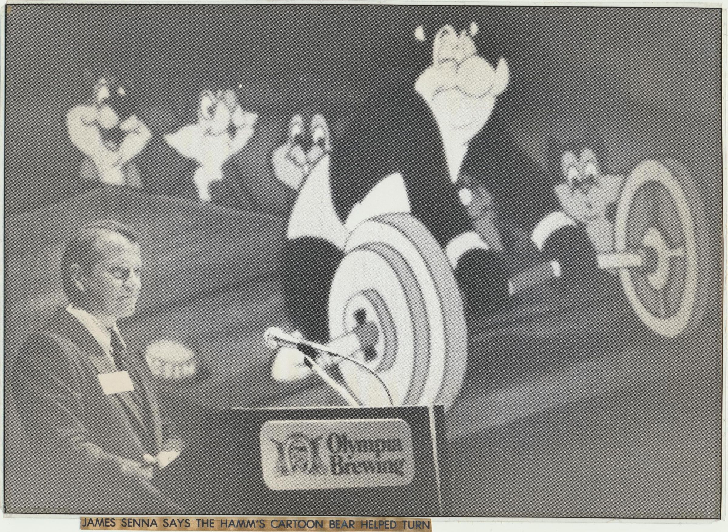 Photograph. B&W. Size 2.5 x 3.5. Photograph of Olympia brewery employee James Senna with Hamm's bear in background. Has wax on back.