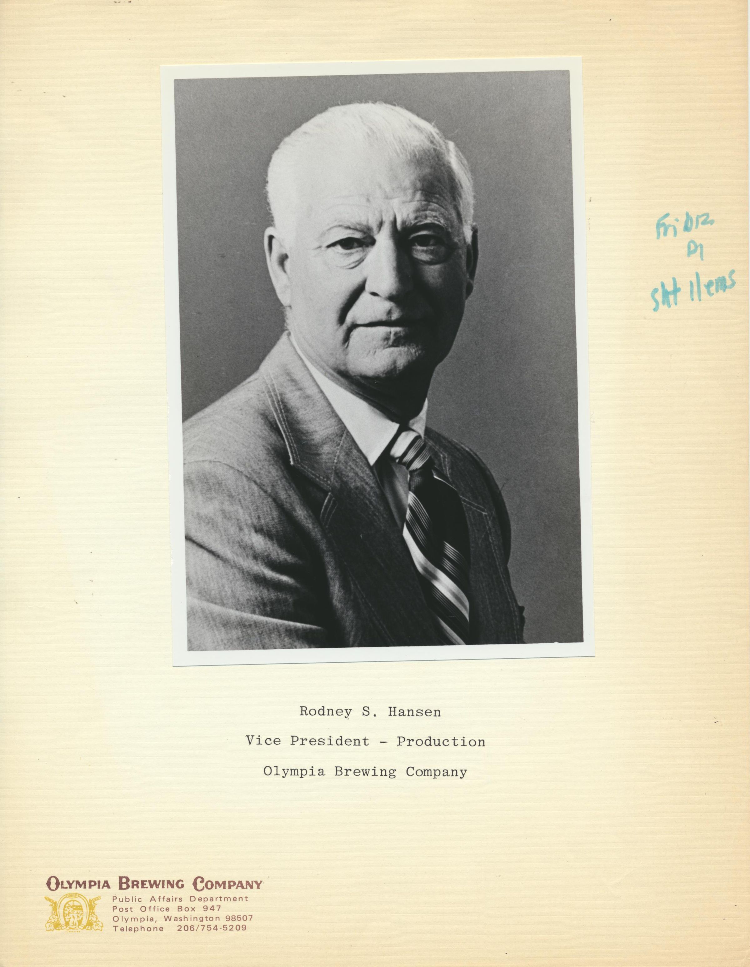Photograph. B&W. Size 5 x 7. Photograph of Olympia brewery employee Rodney S. Hansen. Photo is pasted to Olympia brewery letterhead with "Rodney S. Hansen, Vice President - Production, Olympia Brewing Company" typed below photo. Same as 2017.13.041.Name/Title