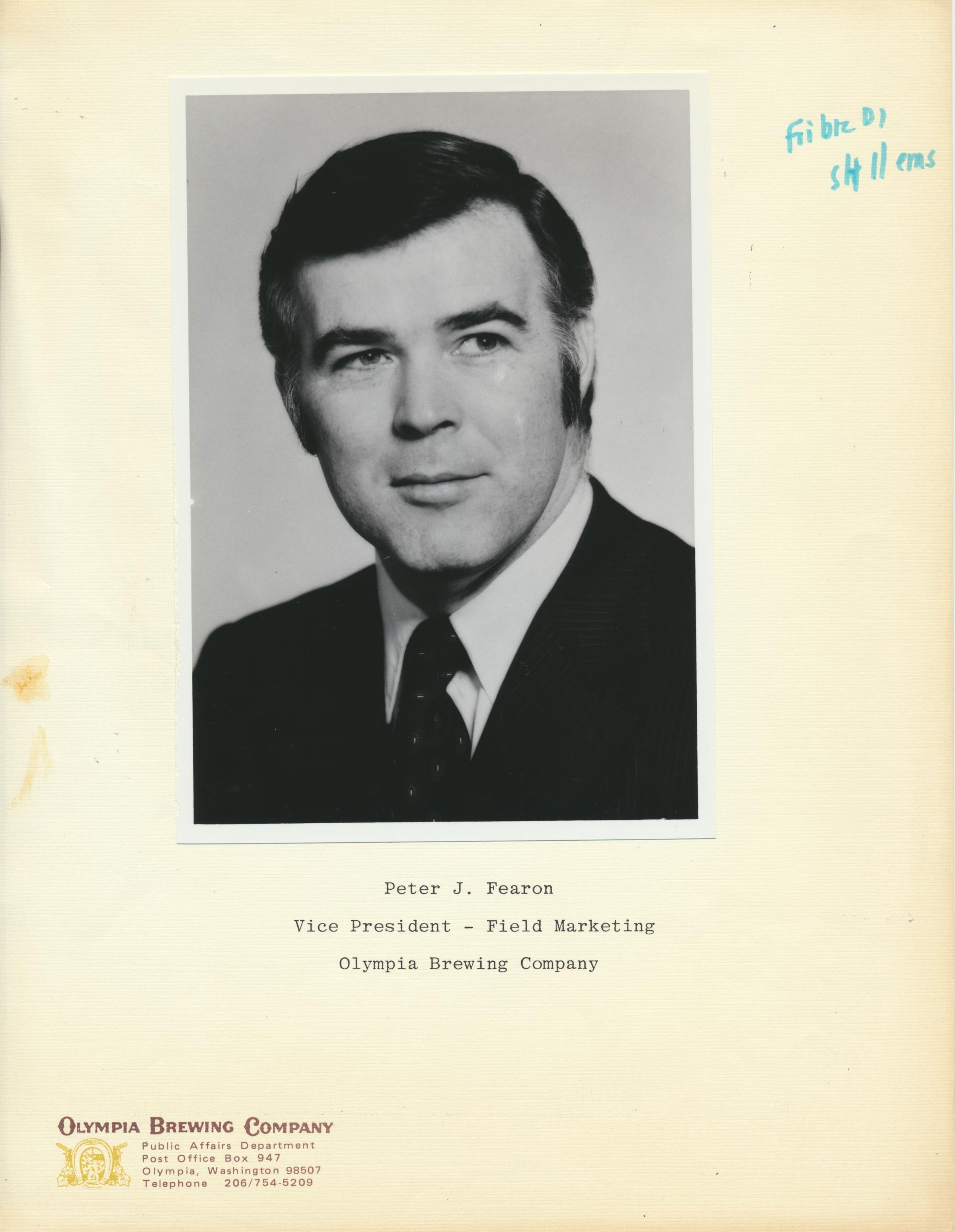 Photograph. B&W. Size 5 x 7. Photograph of Olympia brewery employee Peter J. Fearon. Photo is pasted to Olympia brewery letterhead with "Peter J. Fearon, Vice President - Field Marketing, Olympia Brewing Company" typed below photo. Same as 2017.13.043.Name/Title