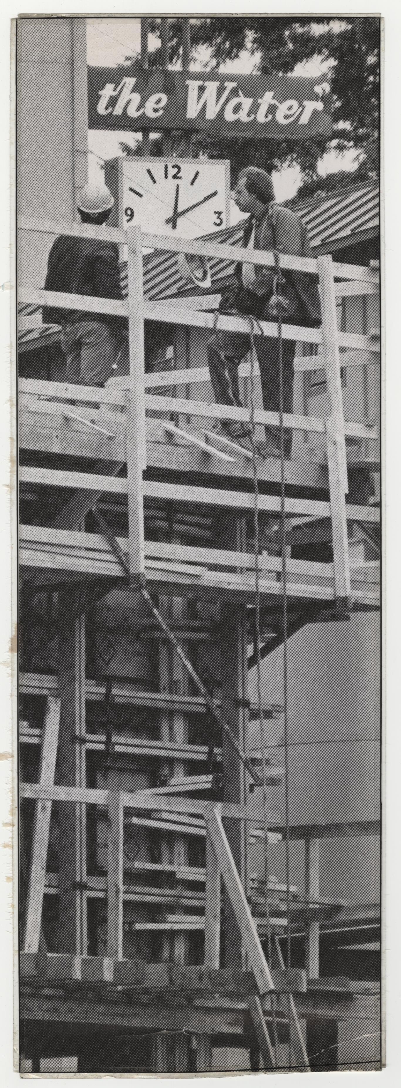 Photograph. B&W. Size 4 x 12. Photograph of workers on scaffolding working on brewery construction. Has thin layer of wax on the back.