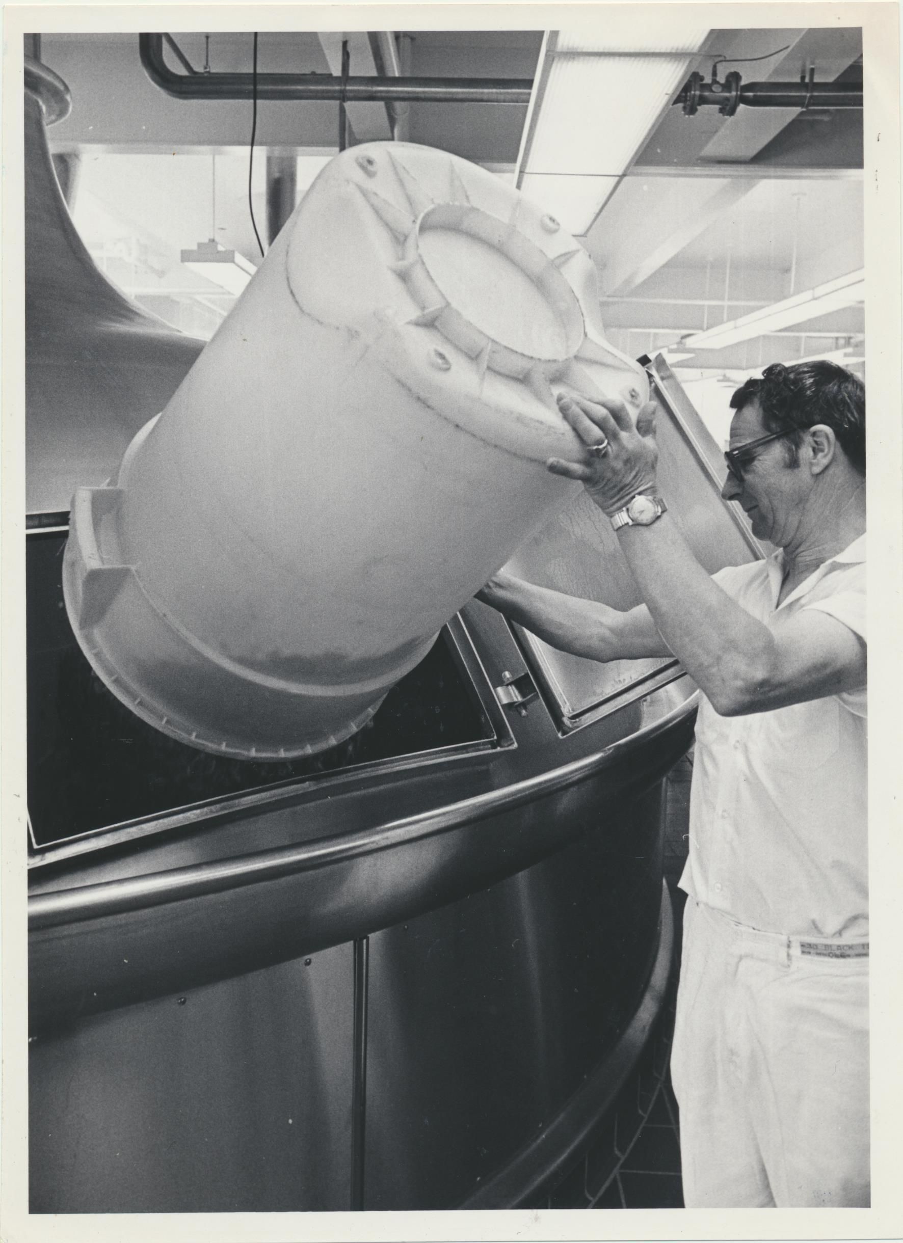 Photograph. B&W. Size 6 x 8.25. 1971 Photograph of brewery employee Ole Hansen emptying hops into brew. Date stamped on back is May 28, 1971.