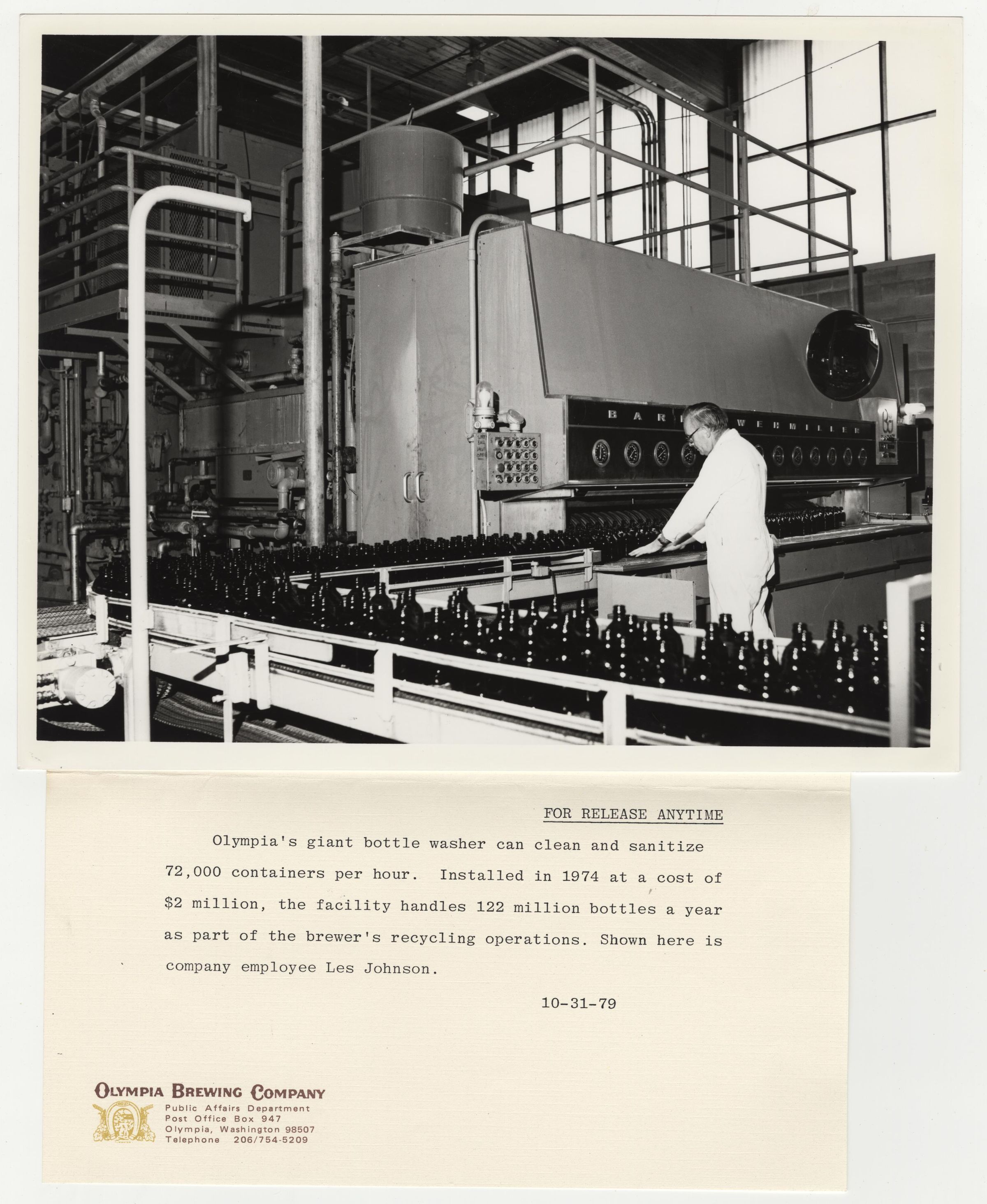Photograph. B&W. Size 8 x 10. 1979 Photograph of bottle washer inside brewery. Attached to photo is press release regarding the bottle washer and recycling operations. Man is Les Johnson.