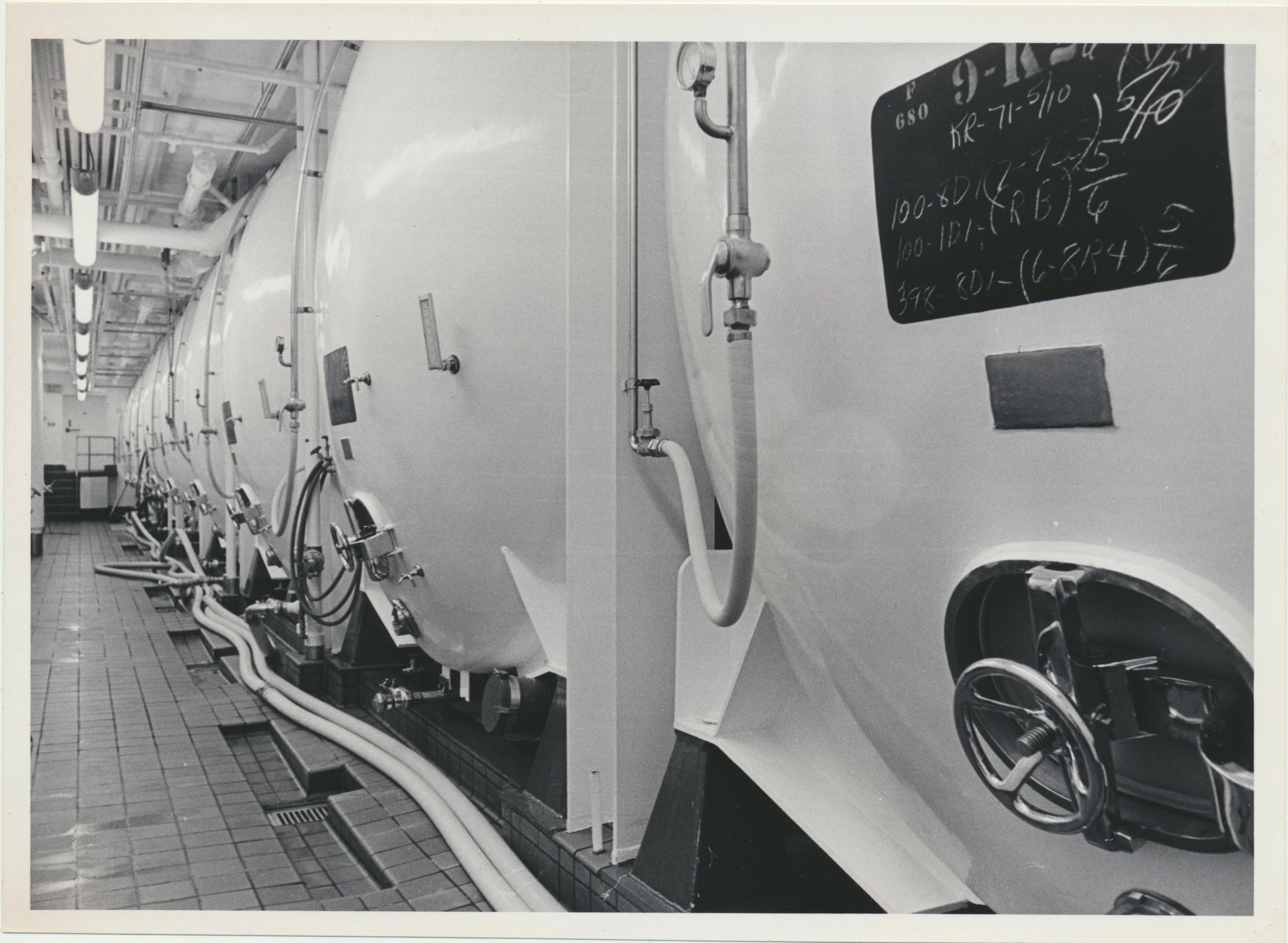 Photograph. B&W. Size 6 x 8. 1971 Photograph of aging tanks in R cellar in post-prohibition brewery. Date stamped May 28, 1971.