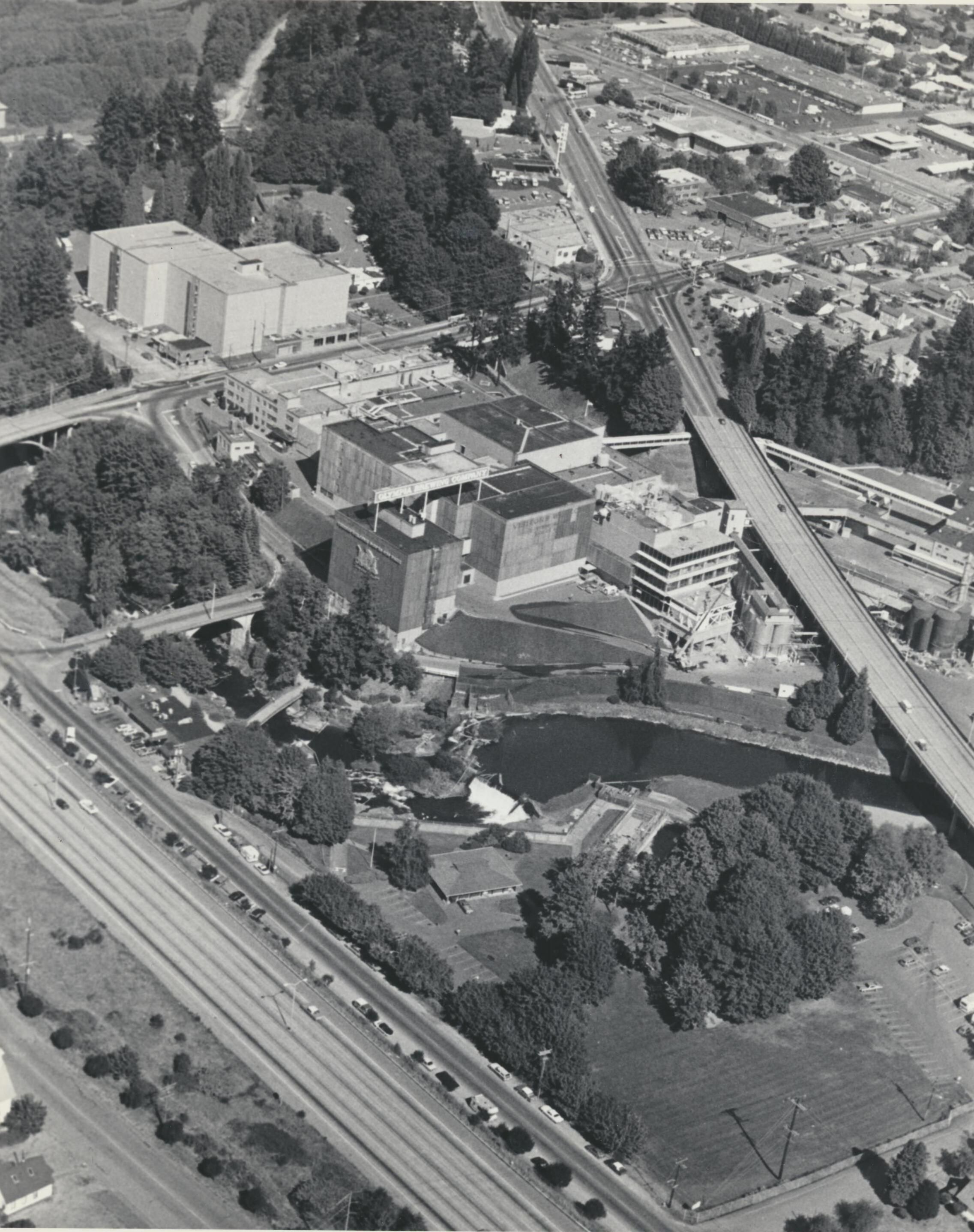 Photograph. B&W. Size 8 x 10. Aerial photograph of the Olympia brewery looking northeast. Alcohol plant under construction (near grain tanks). On far right can be seen 3 dark tanks which held alcohol as part of "waste products recovery plant."Name/Title