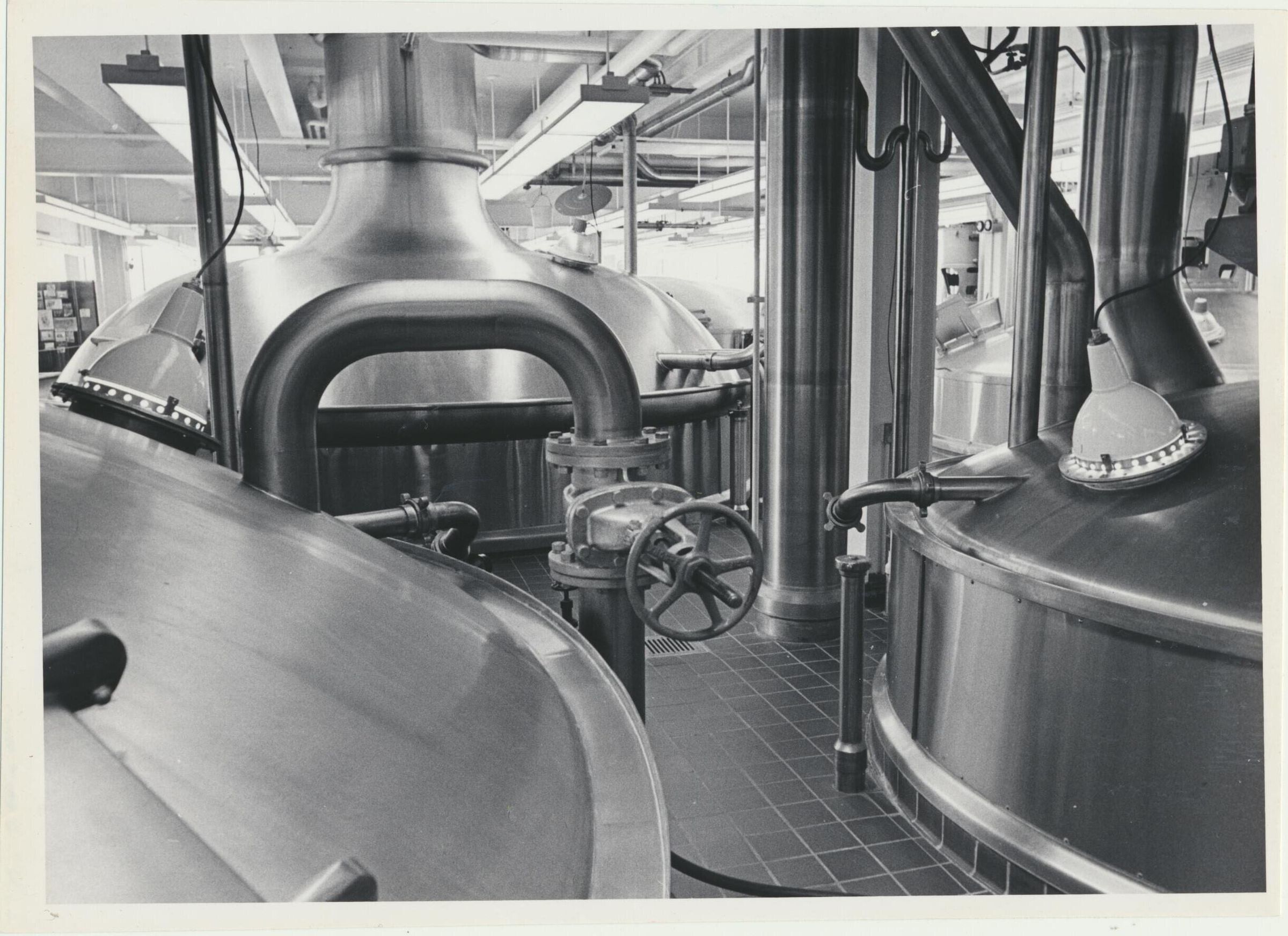 Photograph. B&W. Size 6 x 8. 1971. B brewhouse. Brewkettle in background. Mash tub on left, cereal cooker on right. Date stamped May 28, 1971.