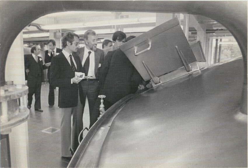 Photograph. B&W. Size 6 x 8. 1977 Photograph of men touring the brew kettles in the post-prohibition brewery. Oct. 3, '77 written on back. Has wax on the back.