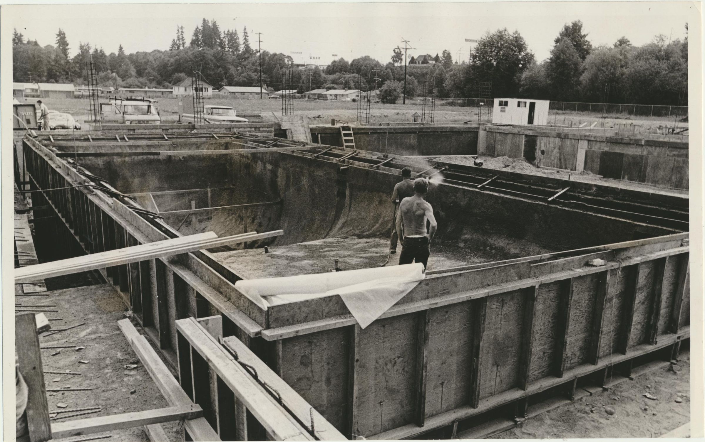 Photograph. B&W. Size 6 x 9.5. 1969 Photograph of construction workers building a foundation at the post-prohibition brewery. Date stamped Jun. 12, 1969. On the back is written "Oly Brew. Co. swim." Swimming pool being built in the valley sports complex.Name/Title