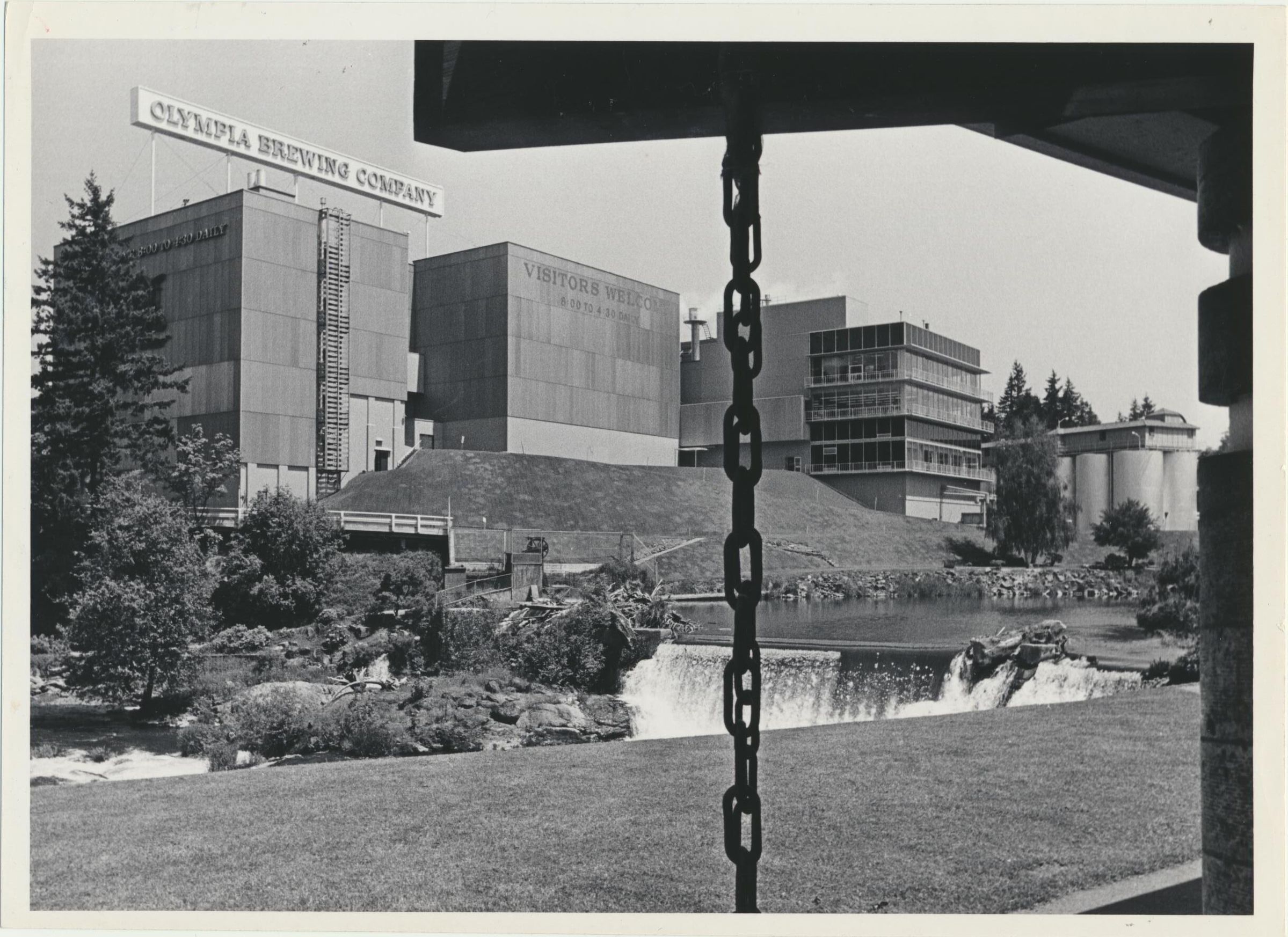 Photograph. B&W. Size 5.75 x 8. Photograph of the post-prohibition Olympia brewery taken from Tumwater Falls Park. On back "Olympia Brewery, A Sparkling, and Oly brew" is written.
