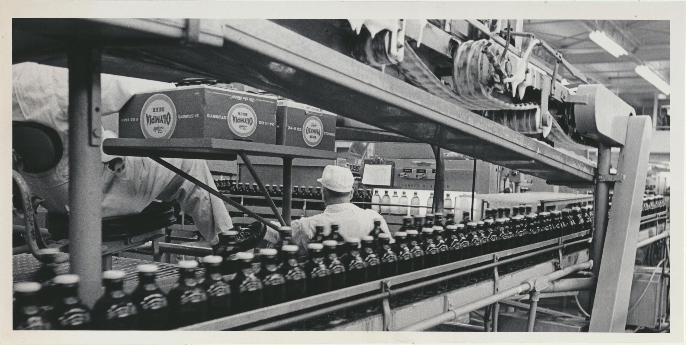 Photograph. B&W. Size 4.75 x 9. 1971 Photograph of employees checking quality of beer while bottles pass in front of light. Date stamped May 28, 1971.