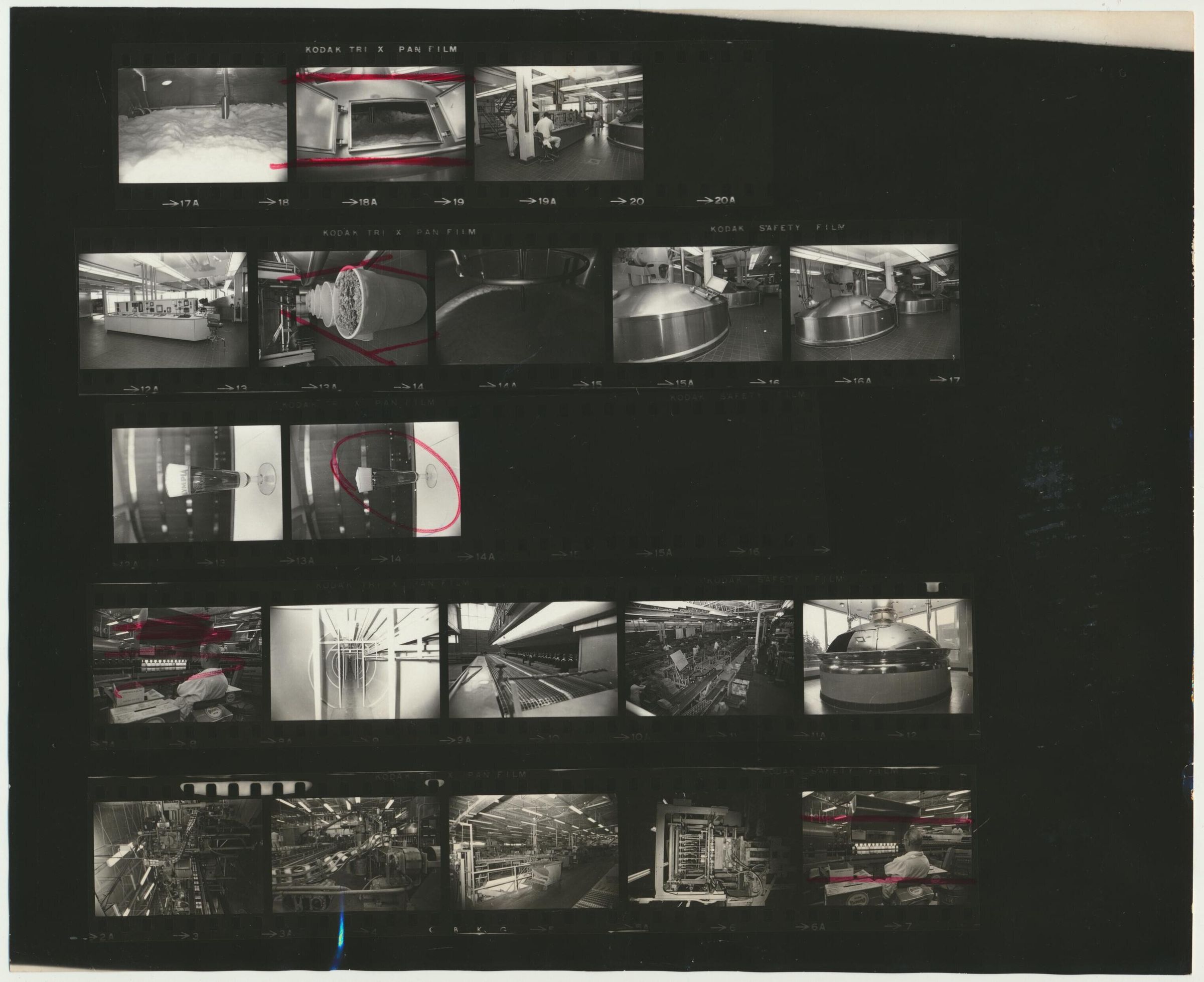 Photograph. B&W. Size 8 x 10. Photograph of negative strips. Images are of machinery, employees, and finished products in the brewery. "3" is written on back.