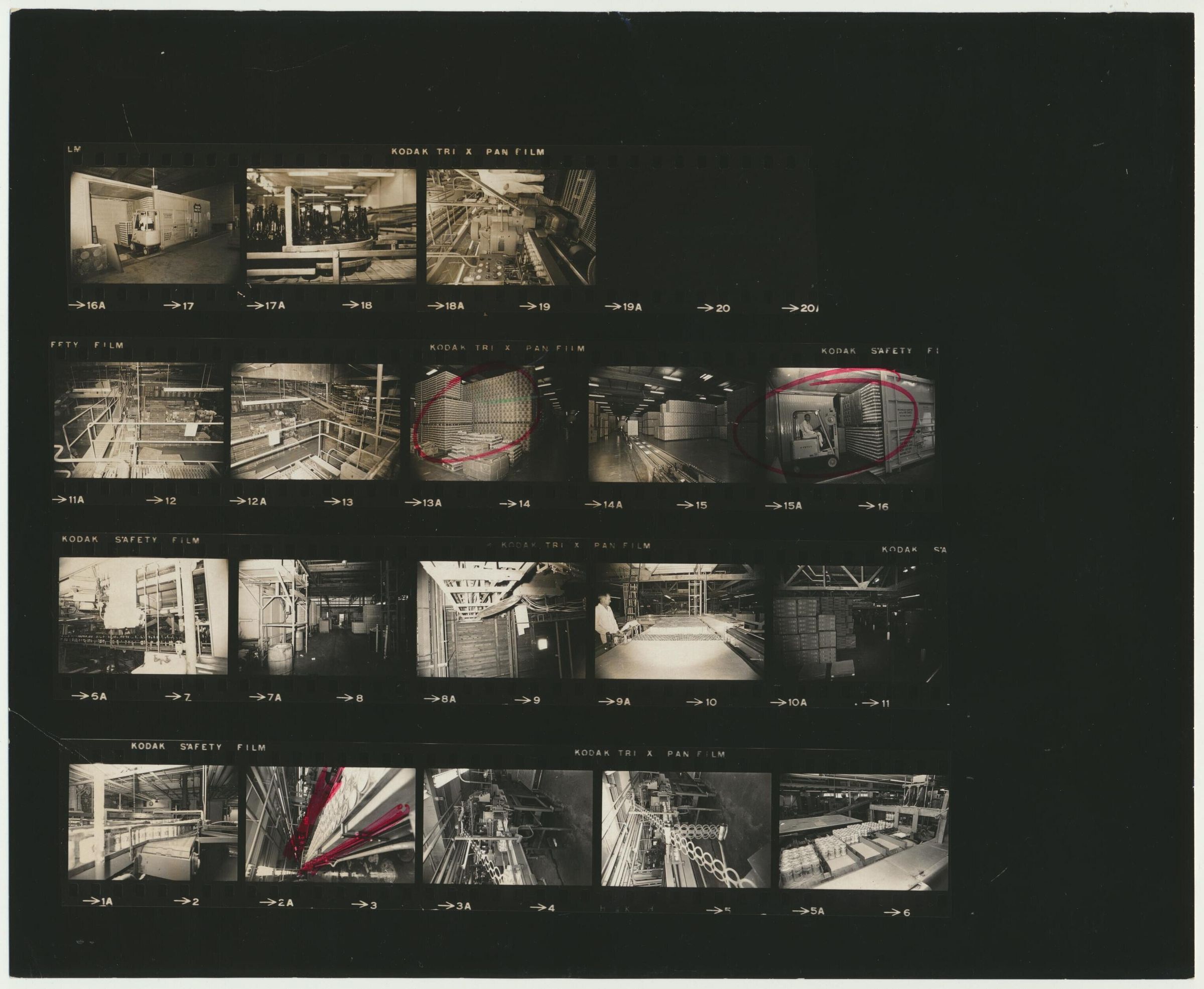 Photograph. B&W. Size 8 x 10. Photograph of negative strips. Images are of machinery, employees, packaging, and finished products in the brewery. "2" is written on the back.