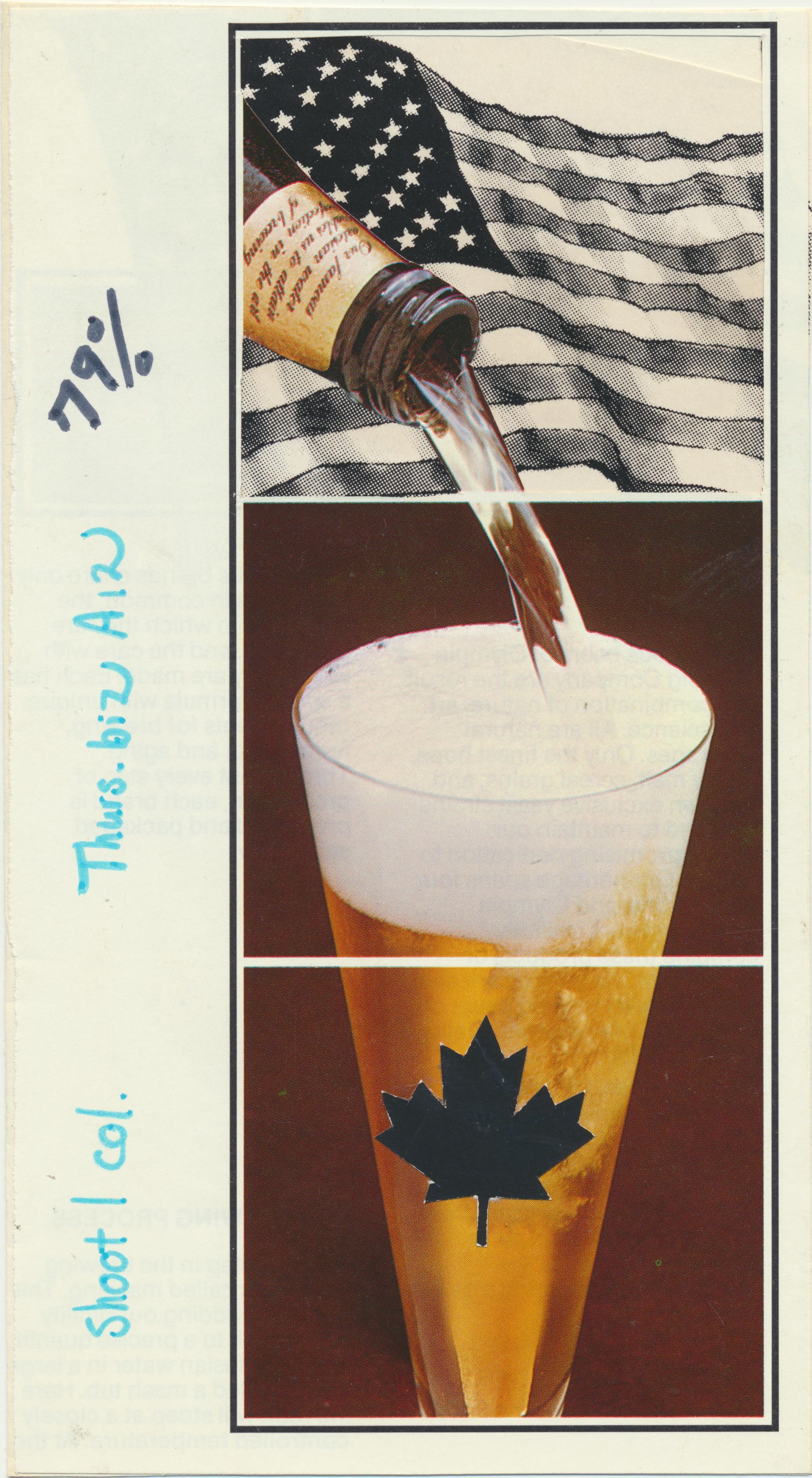 Photograph. Color and B&W. Size 4 x 7.25. Advertising mock-up of beer being poured into a pilsner glass with a maple leaf on it. On the top of the image is an American flag. Notes are written on the side of the image.Name/Title