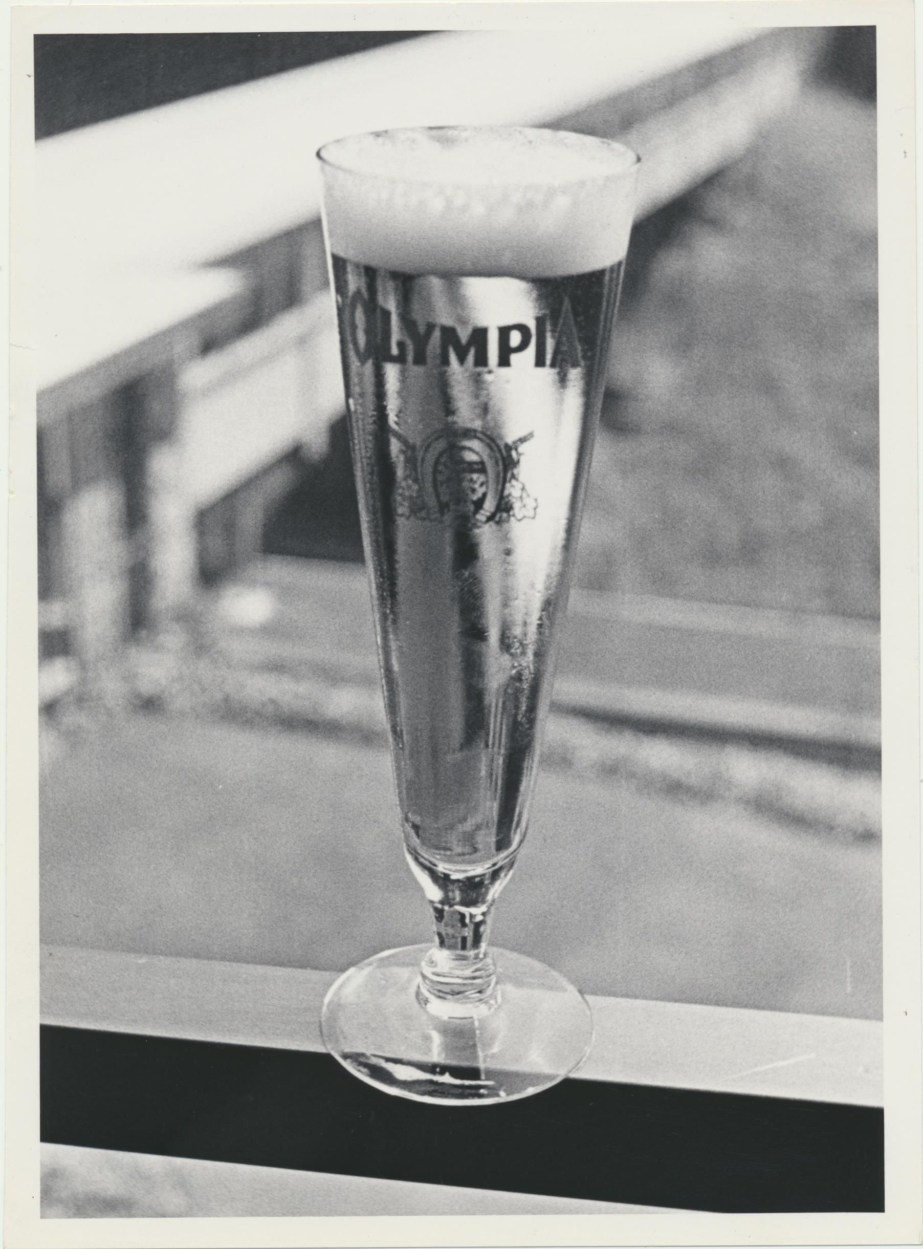 Photograph. B&W. Size 6 x 8. Photograph of Olympia pilsner glass with Olympia logo on it. "A - Thirst Quencher" is written on back. Date stamped May 28, 1971.