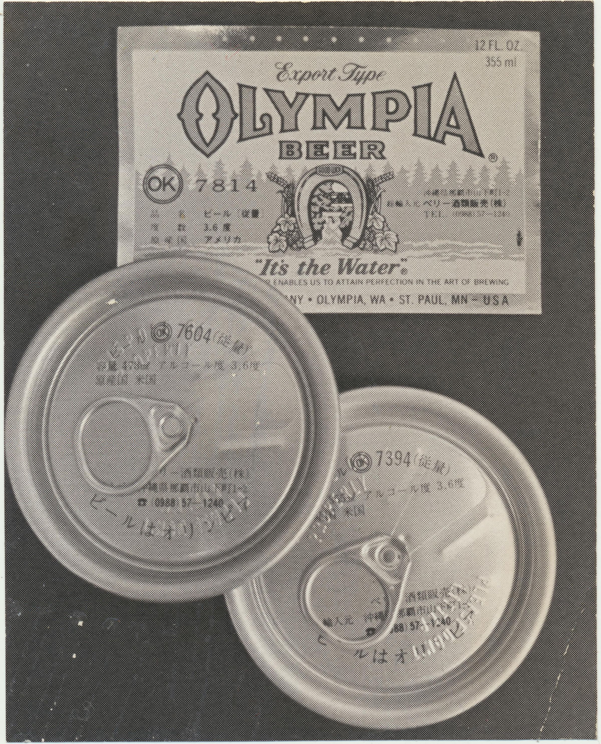 Photograph. B&W. Size 4.5 x 5.5. Photograph of two tops of pull-tab cans and Olympia beer label. Has wax on back.