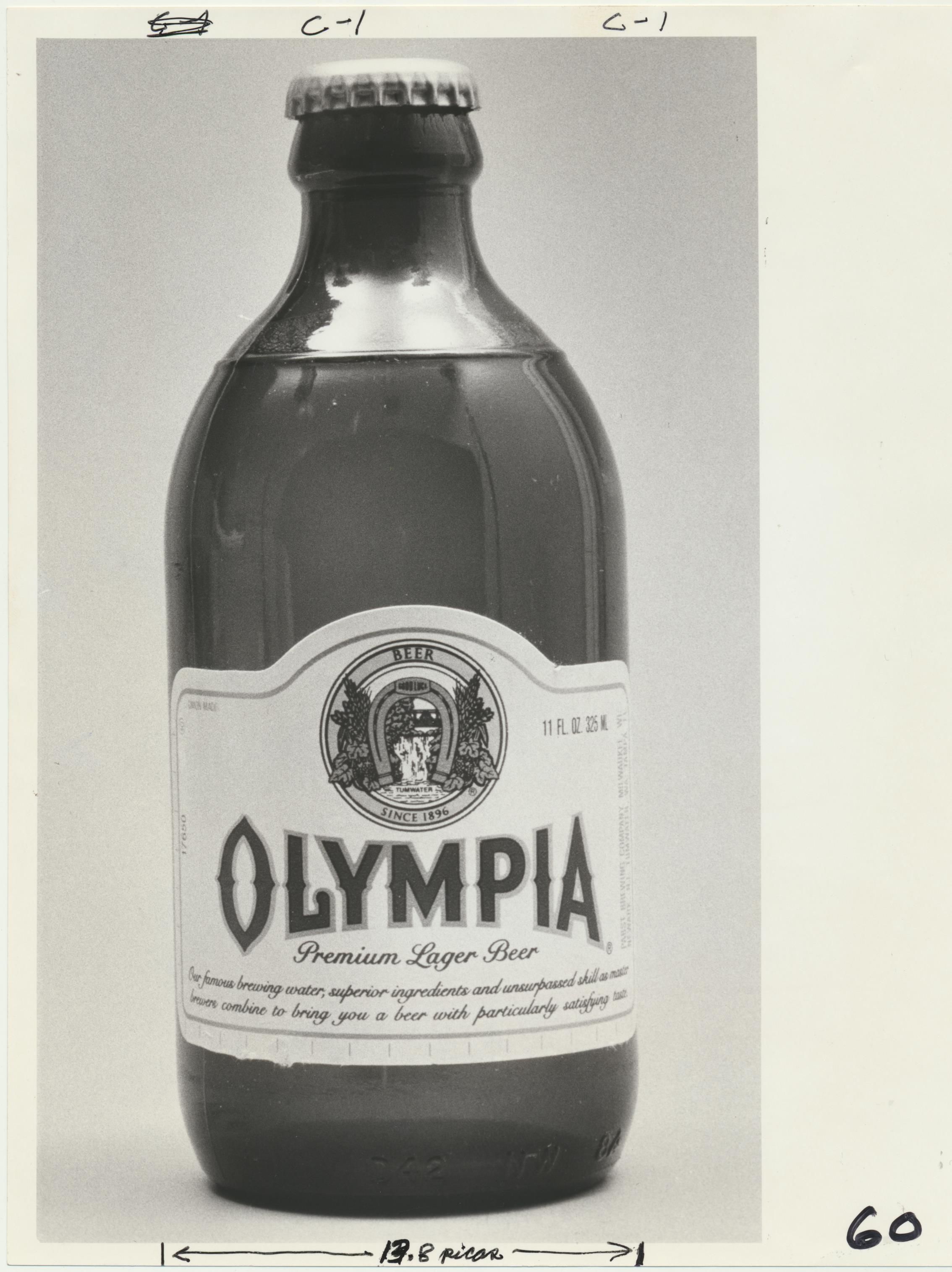 Photograph. B&W. Size 8 x 10. Photograph of Olympia stubby bottle with some notes written around it.