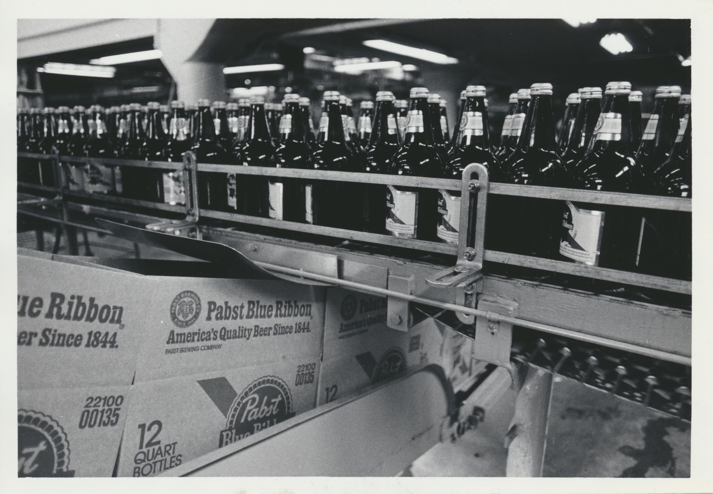Photograph. B&W. Size 5 x 7. Photograph of Pabst bottling or packaging line. "Pabst rolling out at Oly plant" written on back. "Spring 1983" also written on back. Photo by Steve Bloom of the Olympian.Name/Title