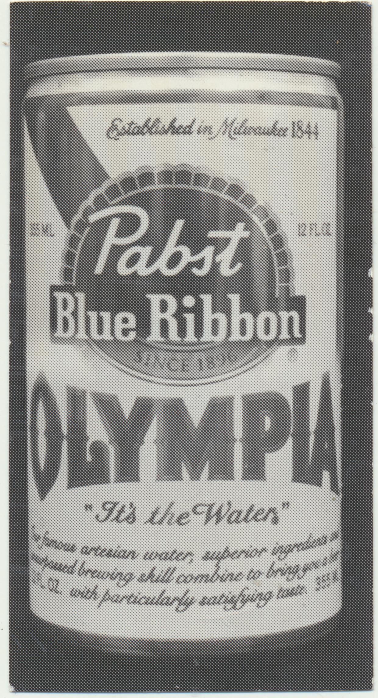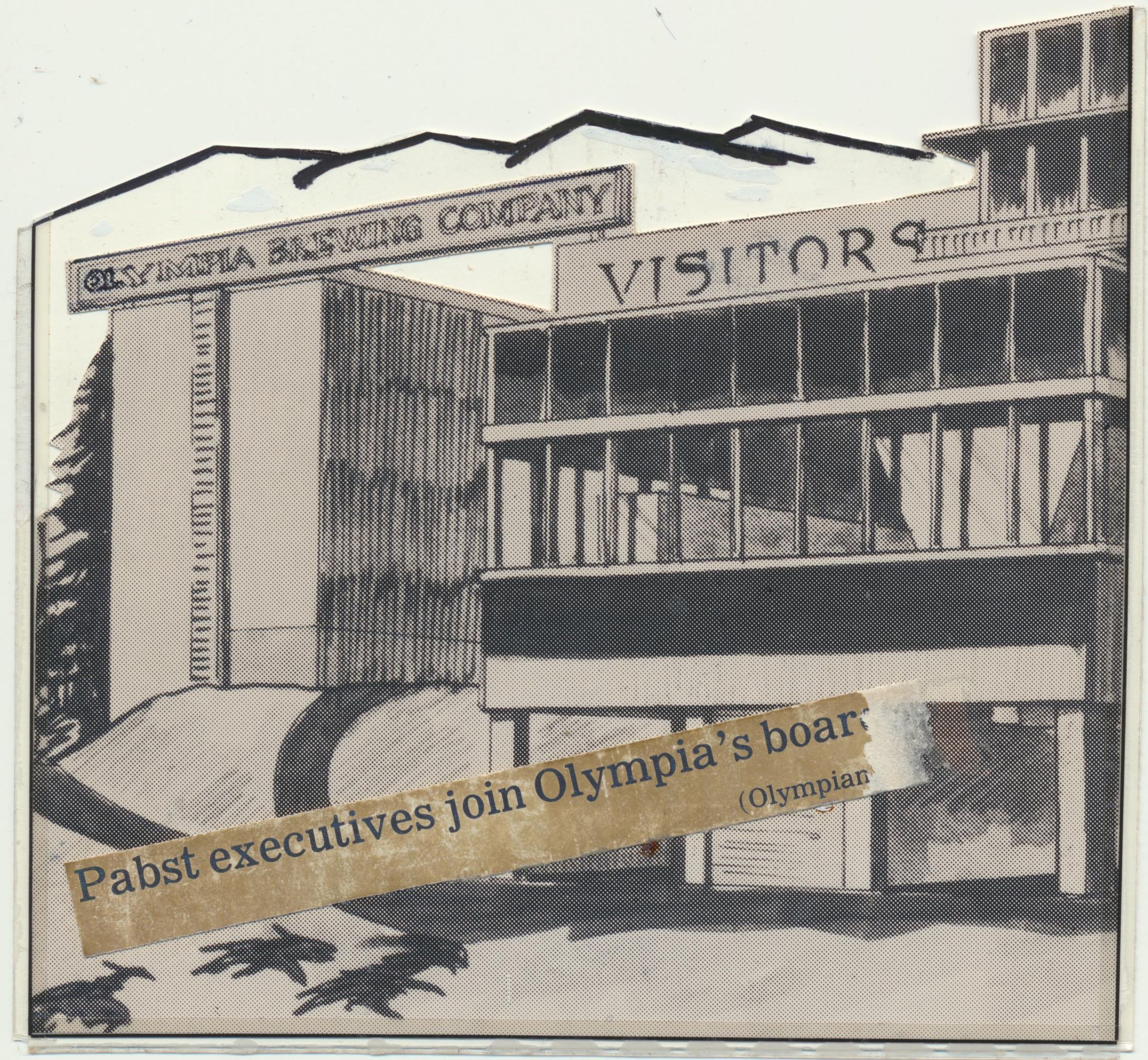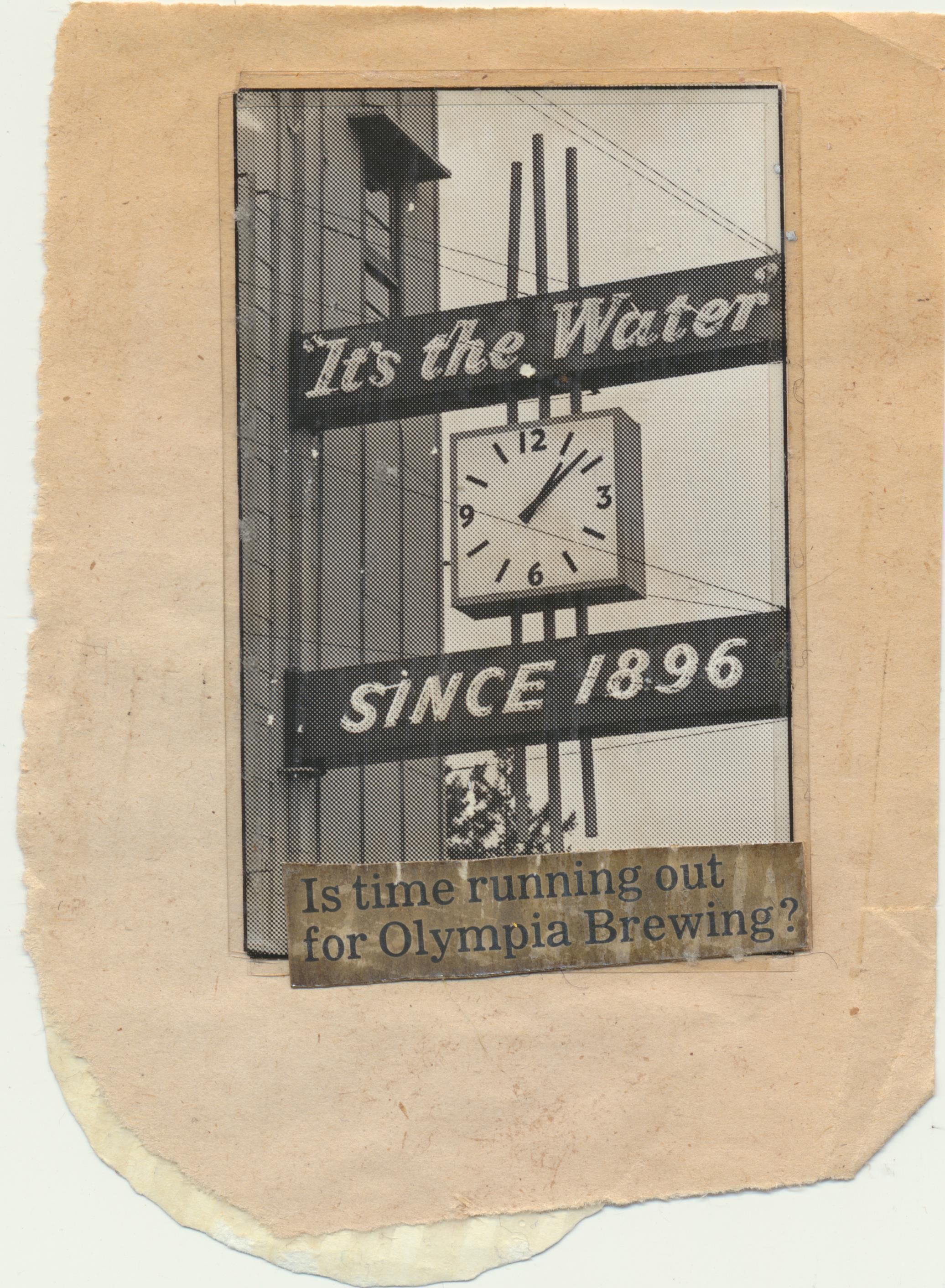Photograph. B&W. Various sizes. Small images used by the Daily Olympian newspaper. Images include the clock formerly on the malt tower, a Pabst Blue Ribbon label, a beer can that is half PBR and half Olympia, a sketch of the brewery with a headline about Pabst, PBR cans, schooner glass of beer, and a label for Grenzquell.Name/Title