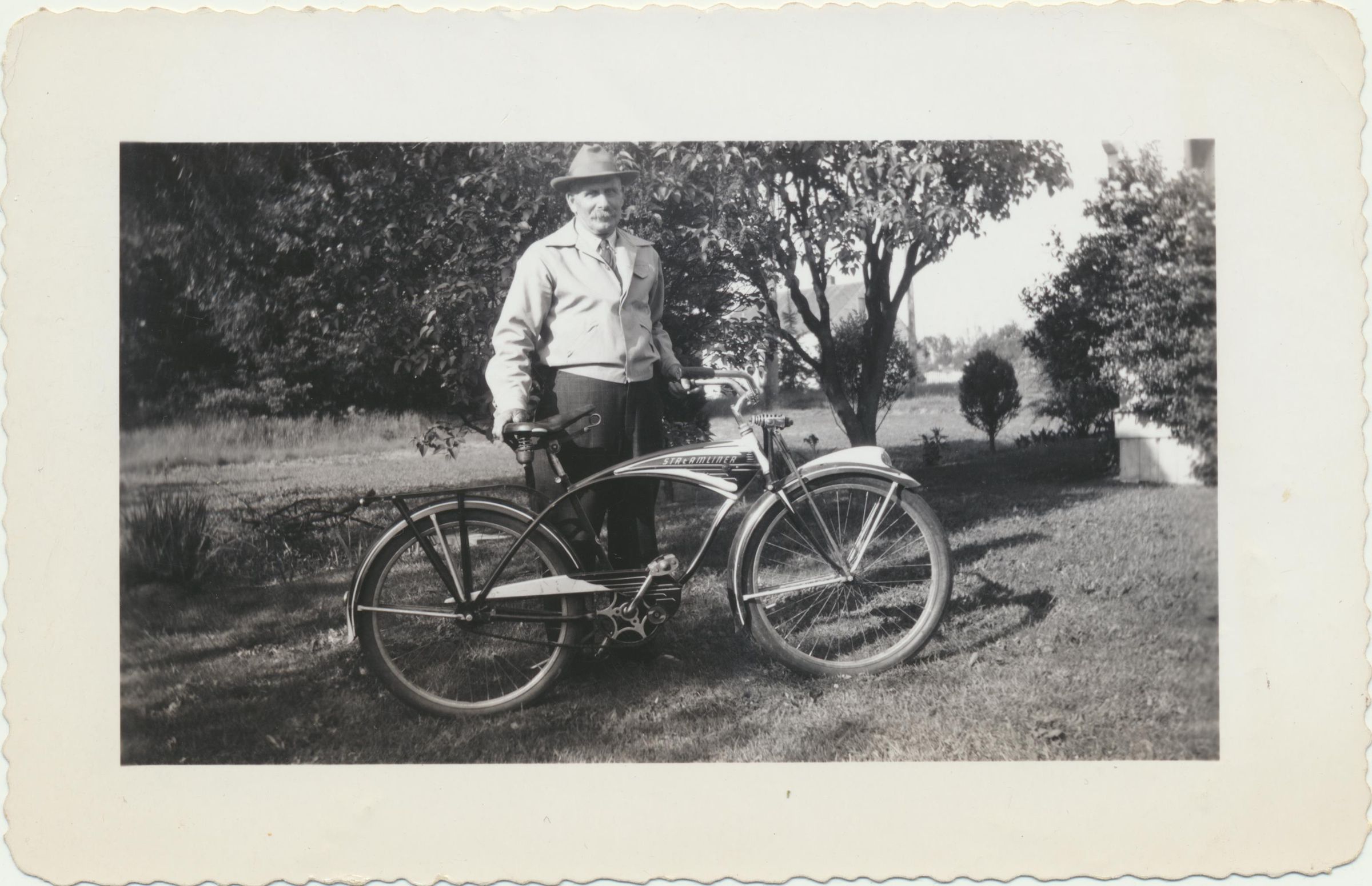 Photograph. B&W. Size 7.5 x 4.25. No date. Ollie Hall standing with Streamliner bicycle.