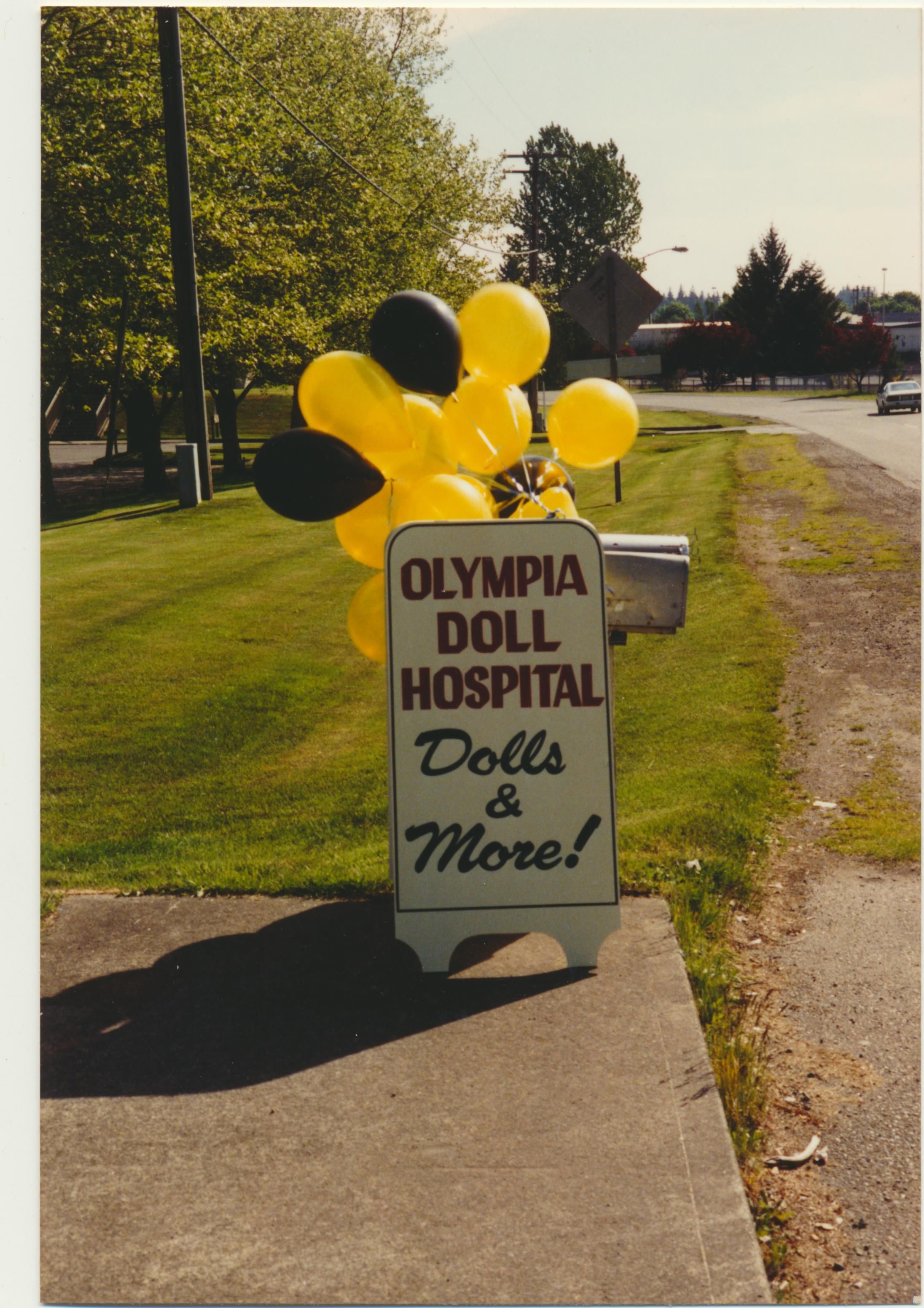 Photograph. Color. Size 5 x 7.25. No date. Sign outside the Olympia Doll Hospital, owned and operated by Sharon (Linderson Horn) Dziekonski.