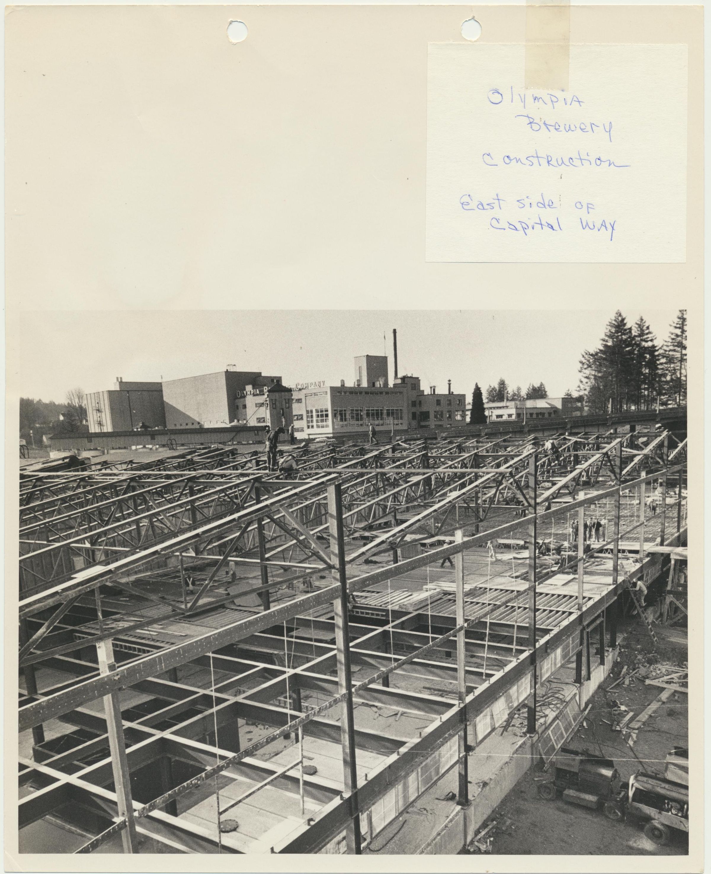 Photograph. B&W. Size 5.75 x 4.5. No date. Photo of B bottleshop construction at the Olympia brewery on the east side of Capitol Way. Circa 1954-55.