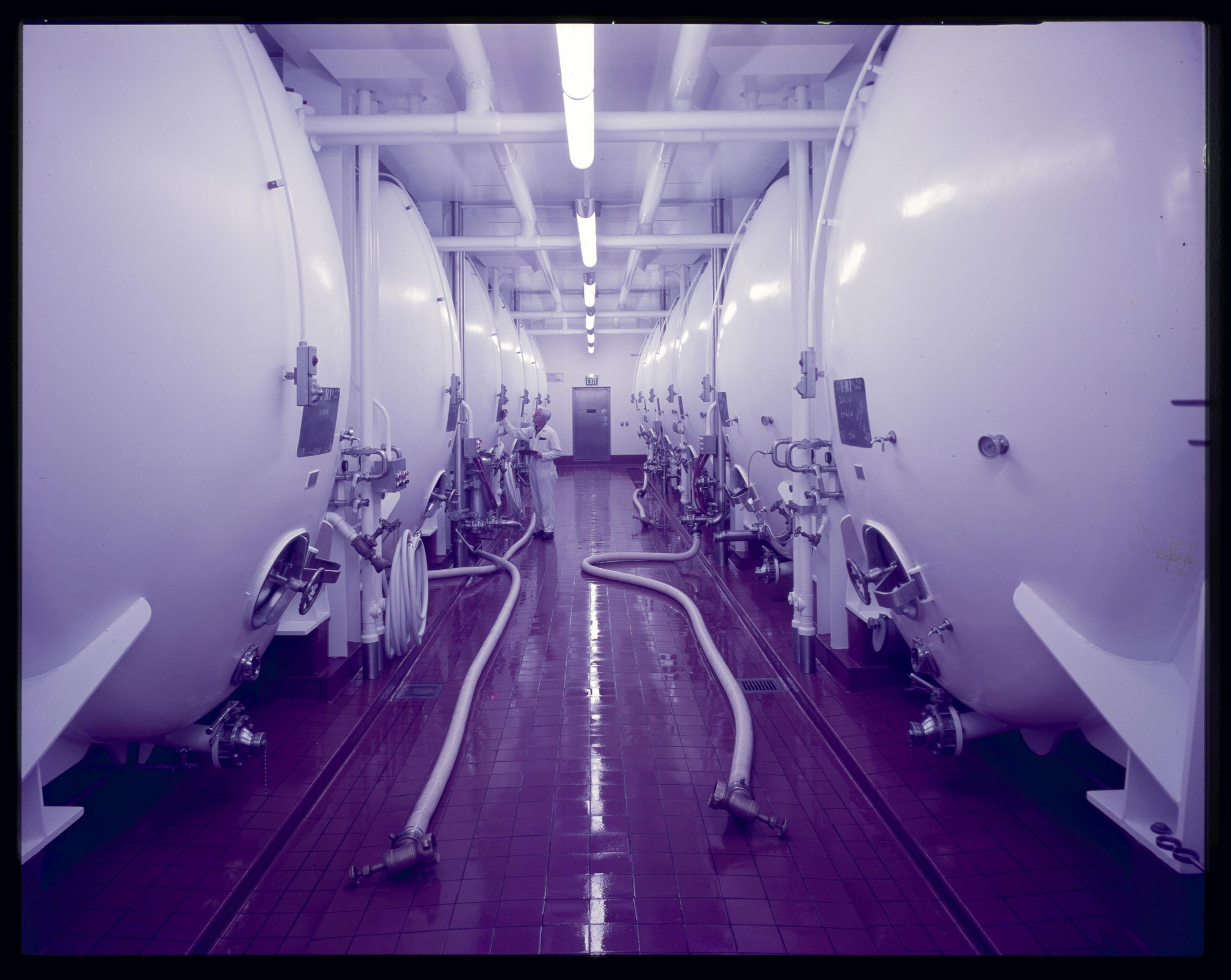 Negative, sheet film. 4 x 5 positive. Tanks in R-1 cellar. Technician is Frank Rush.