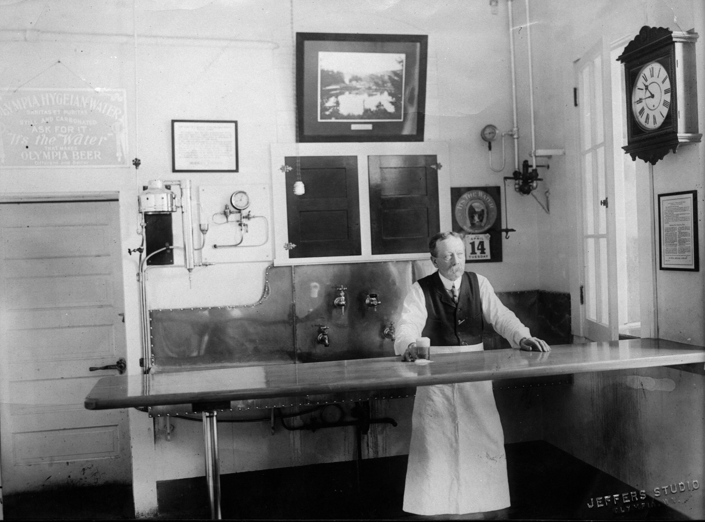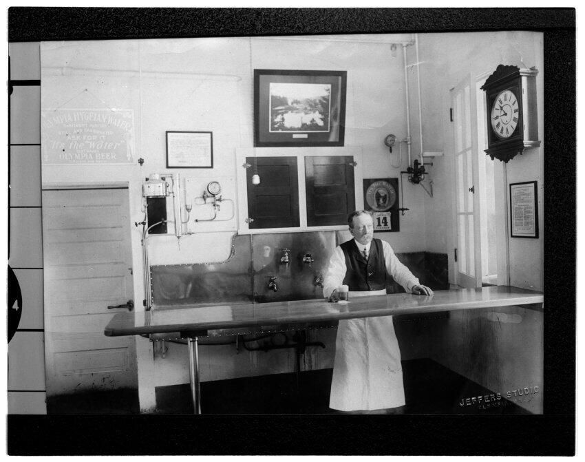 Negative, sheet film. 4 x 5 b&w. Harry Cusack Sr. shown in hospitality room of pre-Pro Olympia Brewing Company. Calendar on wall = April 14, Tuesday. When combined with buildings shown in framed photo on wall, year must be 1908.Other Names and Numbers
