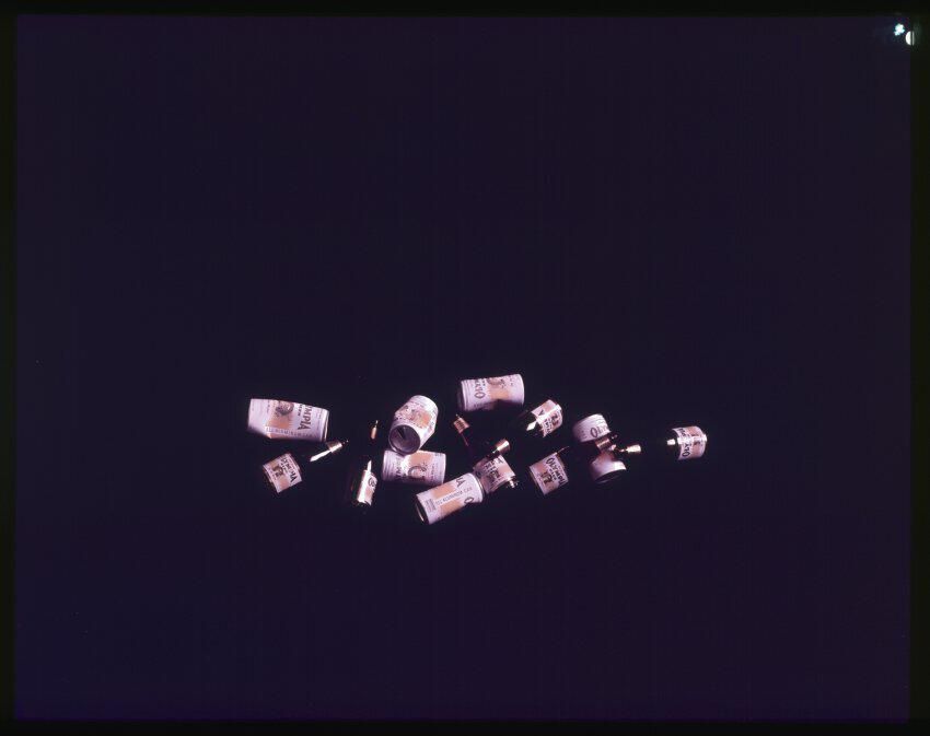 Negative, sheet film. 4 x 5 positive. Photo of empty Olympia beer cans and bottles, probably for an ad about littering or recycling.