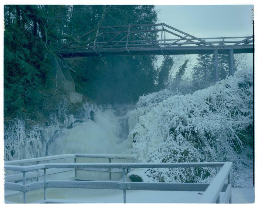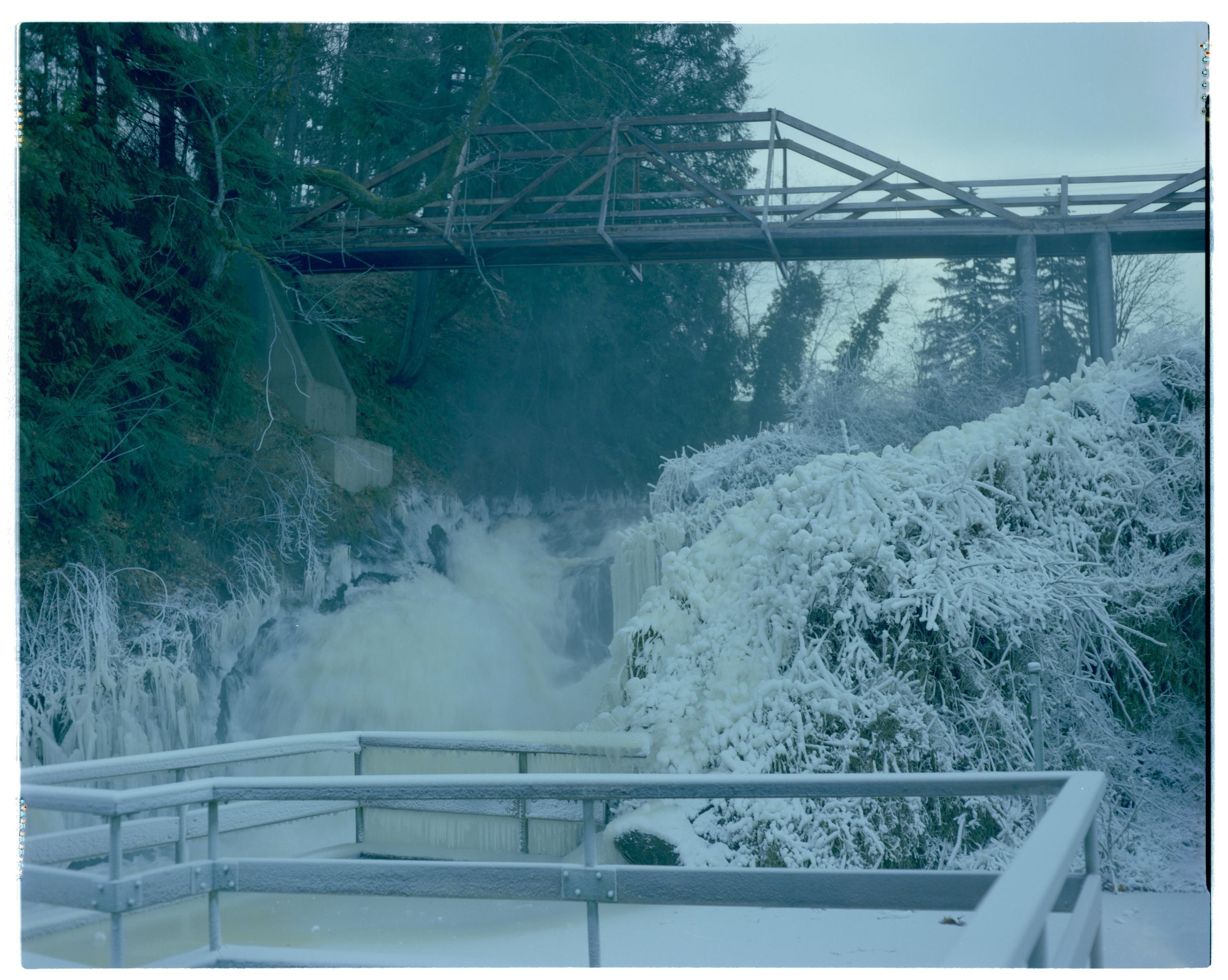 Negative, sheet film. 4 x 5 color. Footbridge and viewing platform at lower falls of Deschutes River. Snow and ice.